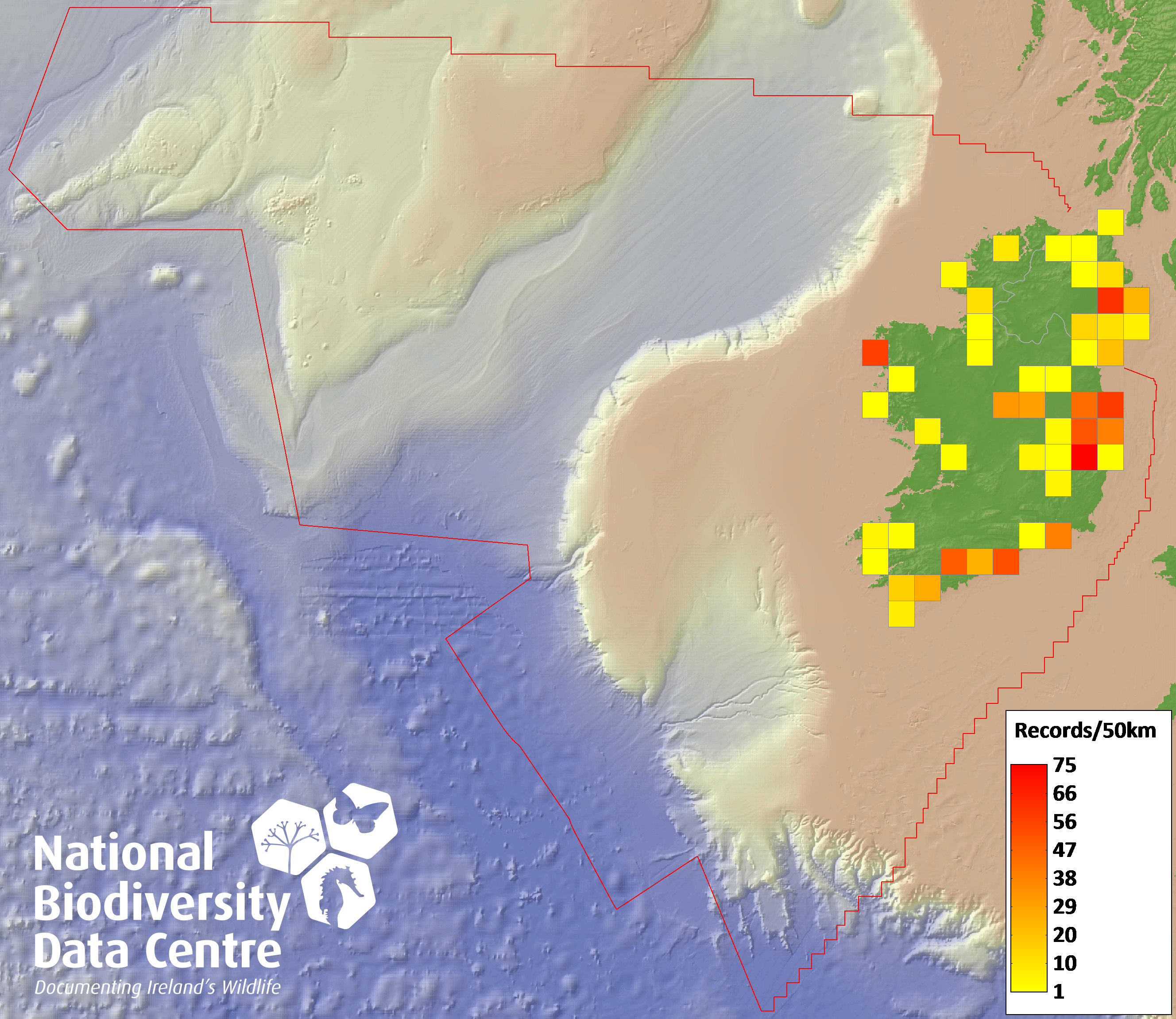 Distribution of the number of records recorded within each 10km grid square (ITM).Marine Map - 50km