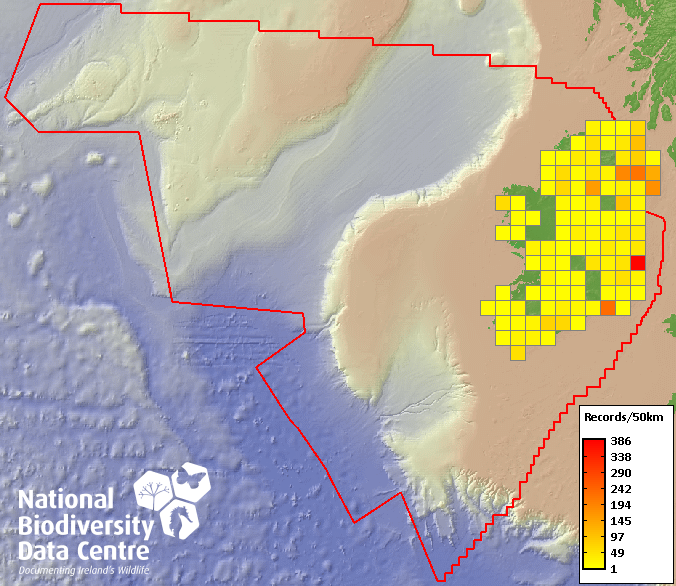 Distribution of the number of records recorded within each 10km grid square (ITM).Marine Map - 50km