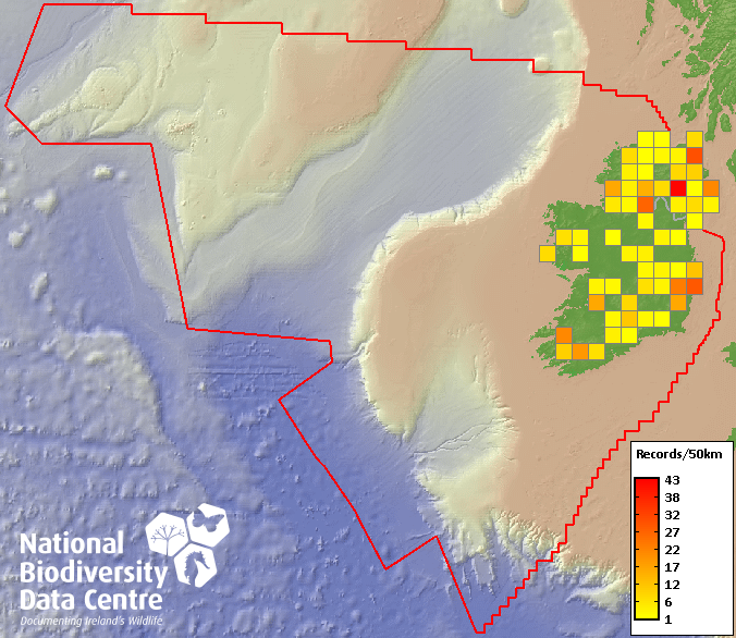Distribution of the number of records recorded within each 10km grid square (ITM).Marine Map - 50km