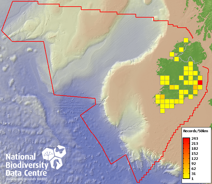 Distribution of the number of records recorded within each 10km grid square (ITM).Marine Map - 50km