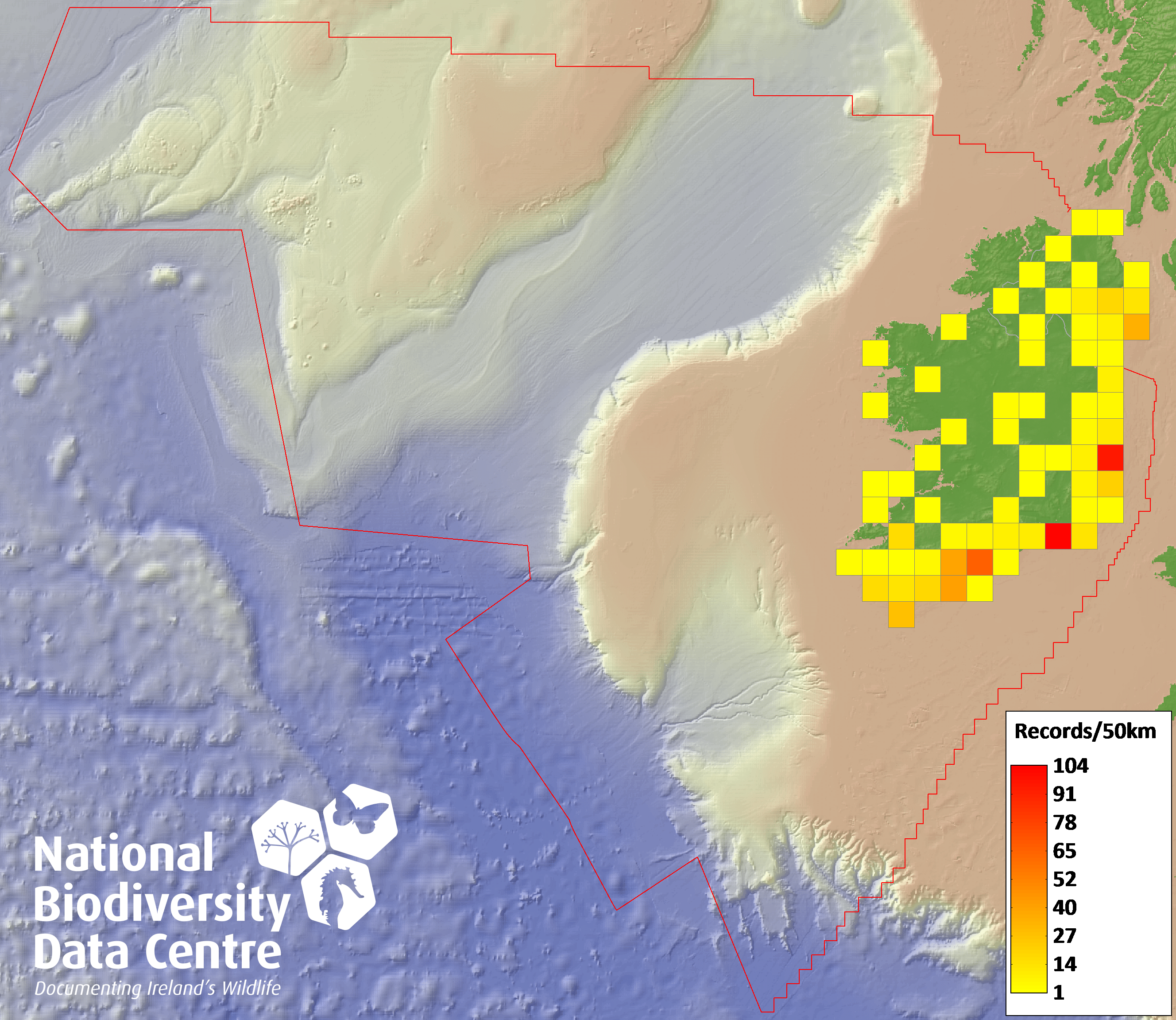 Distribution of the number of records recorded within each 10km grid square (ITM).Marine Map - 50km