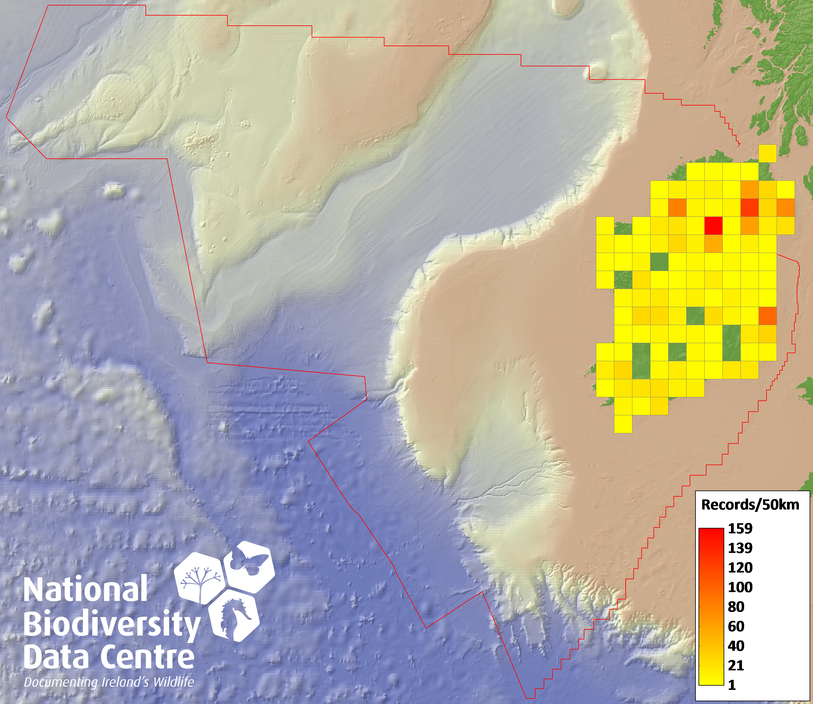Distribution of the number of records recorded within each 10km grid square (ITM).Marine Map - 50km