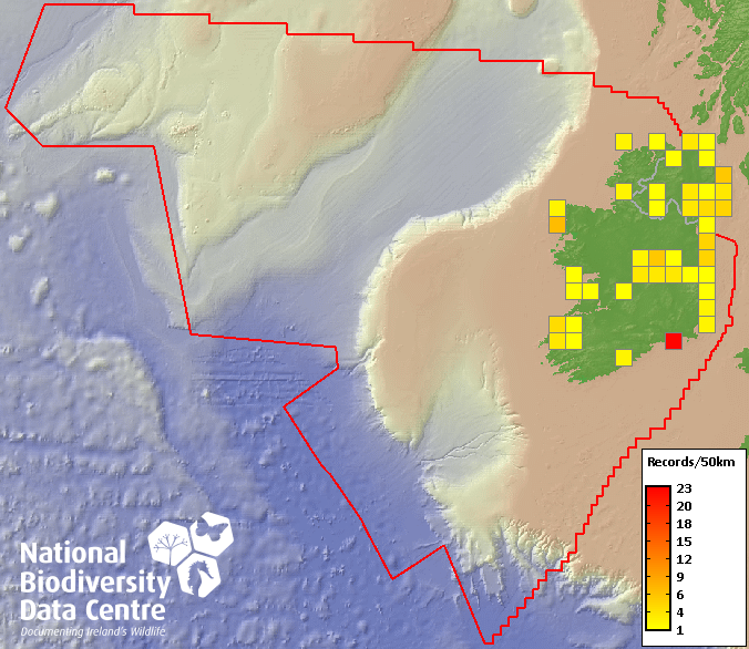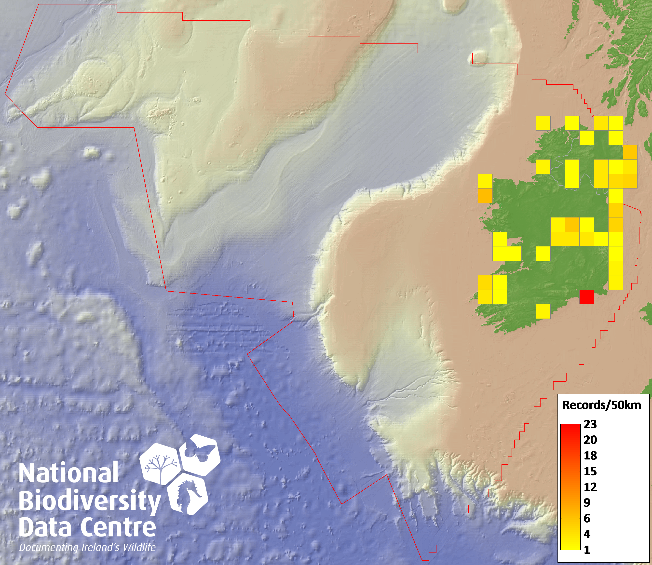 Distribution of the number of records recorded within each 10km grid square (ITM).Marine Map - 50km