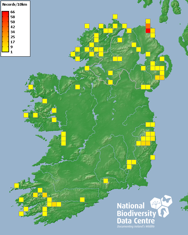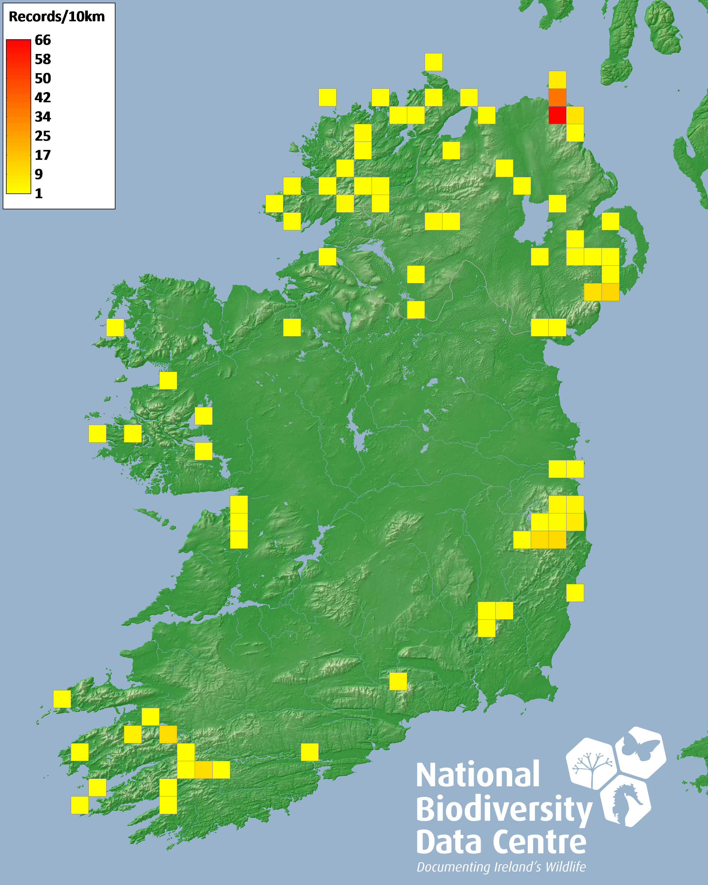 Distribution of the number of records recorded within each 10km grid square (ITM).Marine Map - 50km