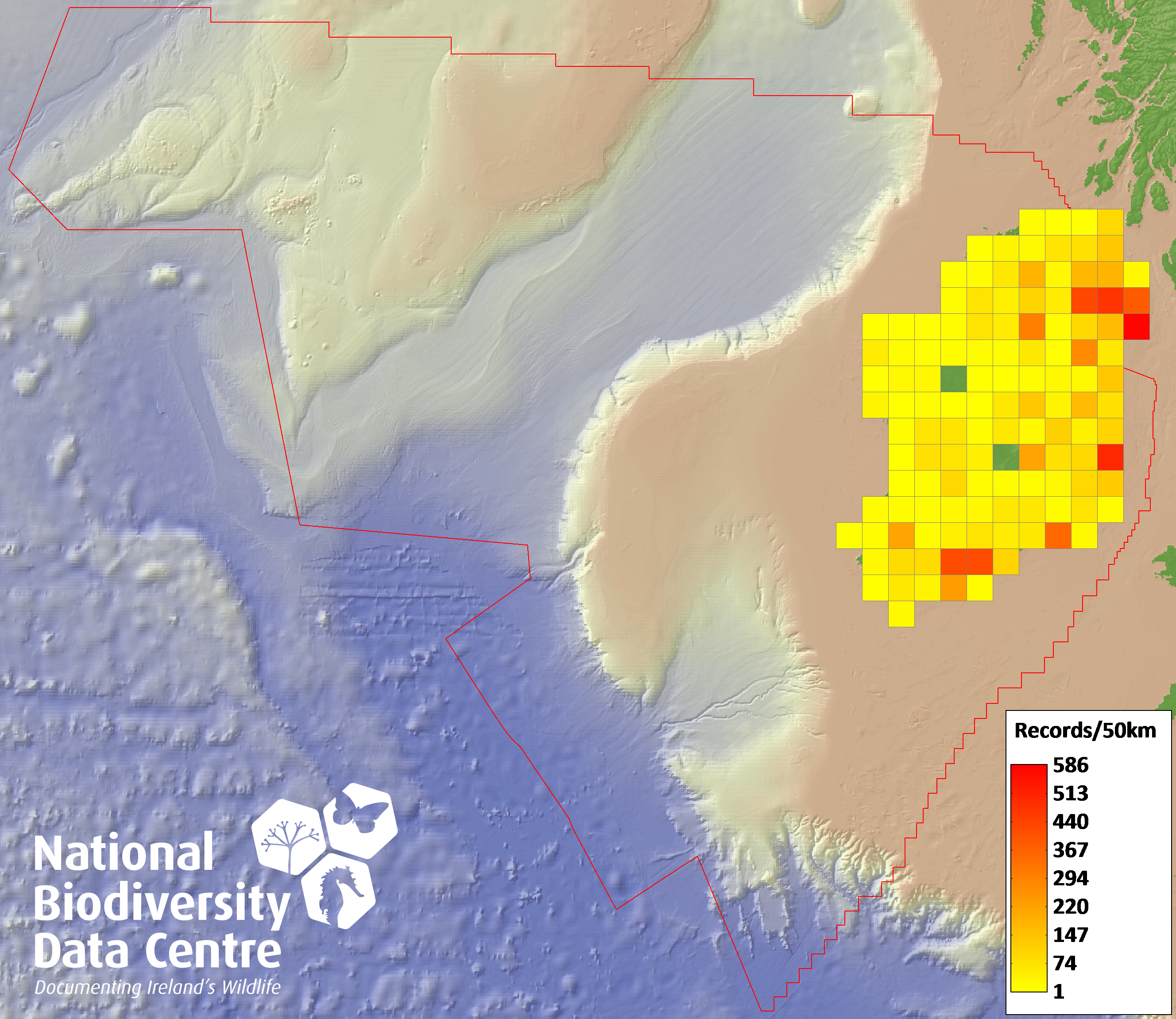 Distribution of the number of records recorded within each 10km grid square (ITM).Marine Map - 50km