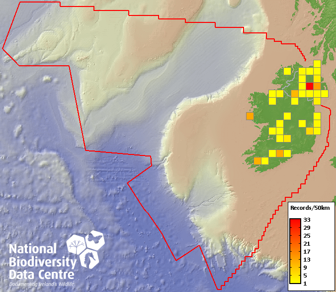 Distribution of the number of records recorded within each 10km grid square (ITM).Marine Map - 50km