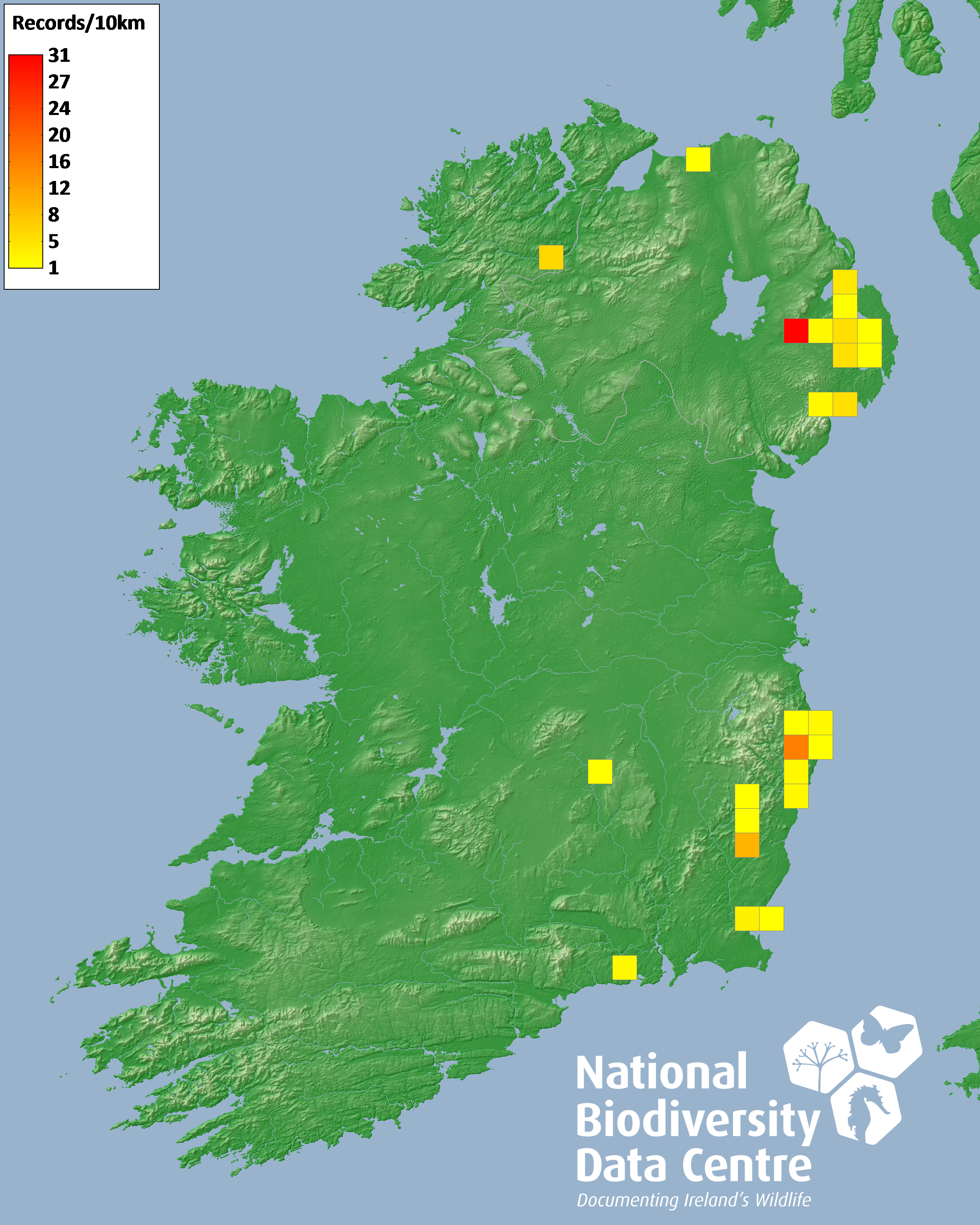 Distribution of the number of records recorded within each 10km grid square (ITM).Marine Map - 50km