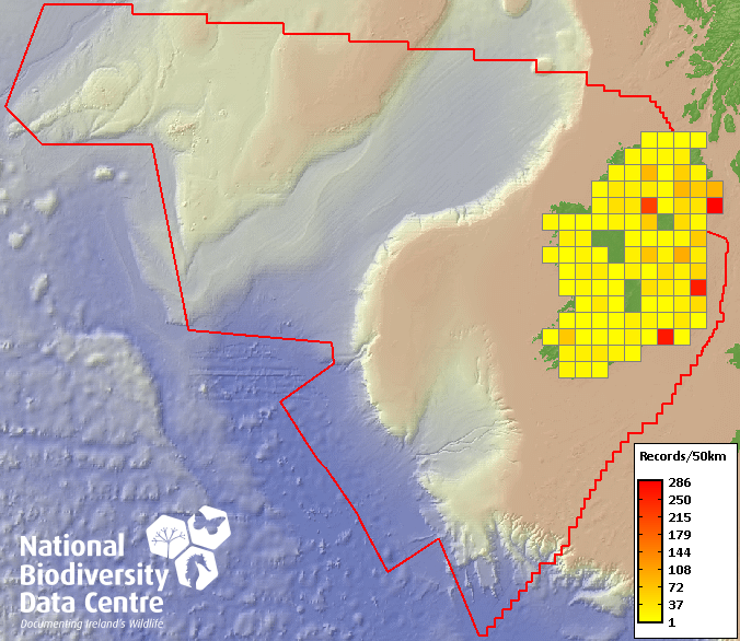 Distribution of the number of records recorded within each 10km grid square (ITM).Marine Map - 50km