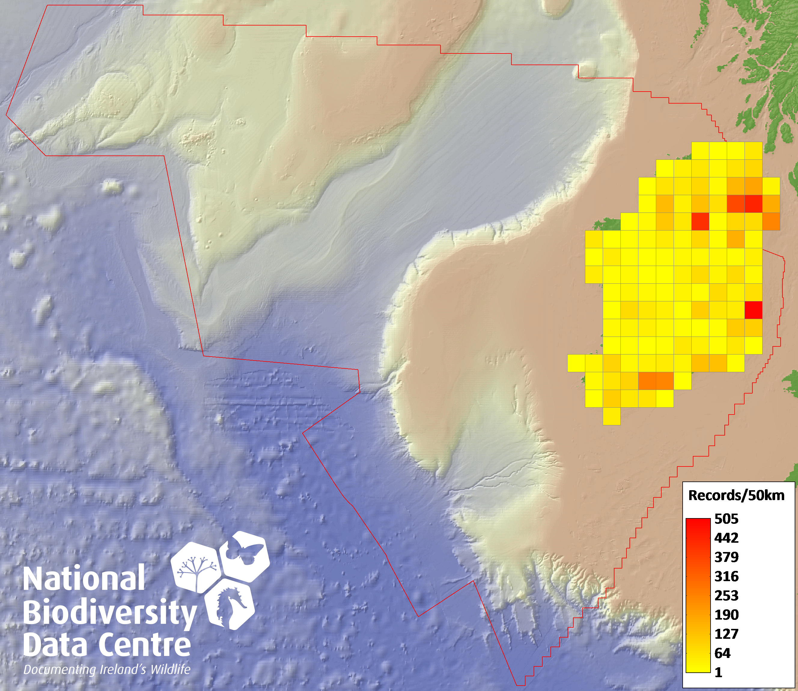 Distribution of the number of records recorded within each 10km grid square (ITM).Marine Map - 50km