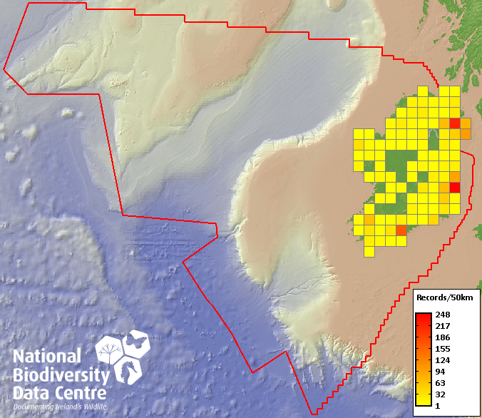 Distribution of the number of records recorded within each 10km grid square (ITM).Marine Map - 50km