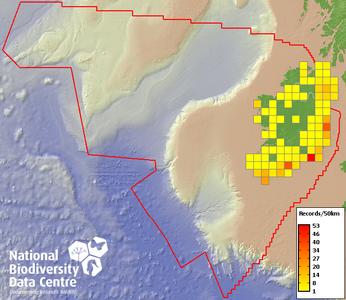 Distribution of the number of records recorded within each 10km grid square (ITM).Marine Map - 50km