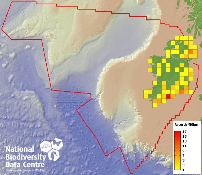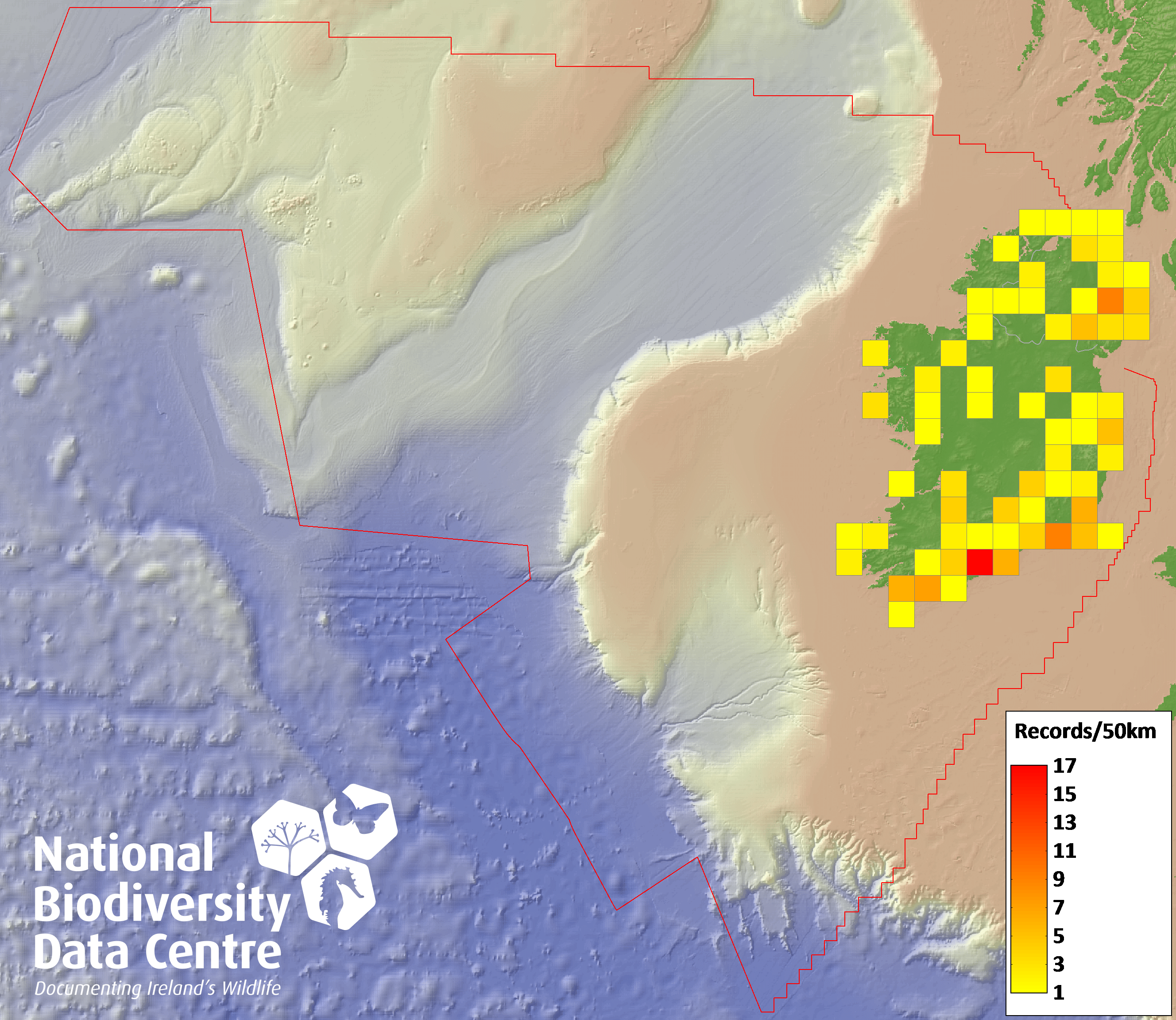 Distribution of the number of records recorded within each 10km grid square (ITM).Marine Map - 50km