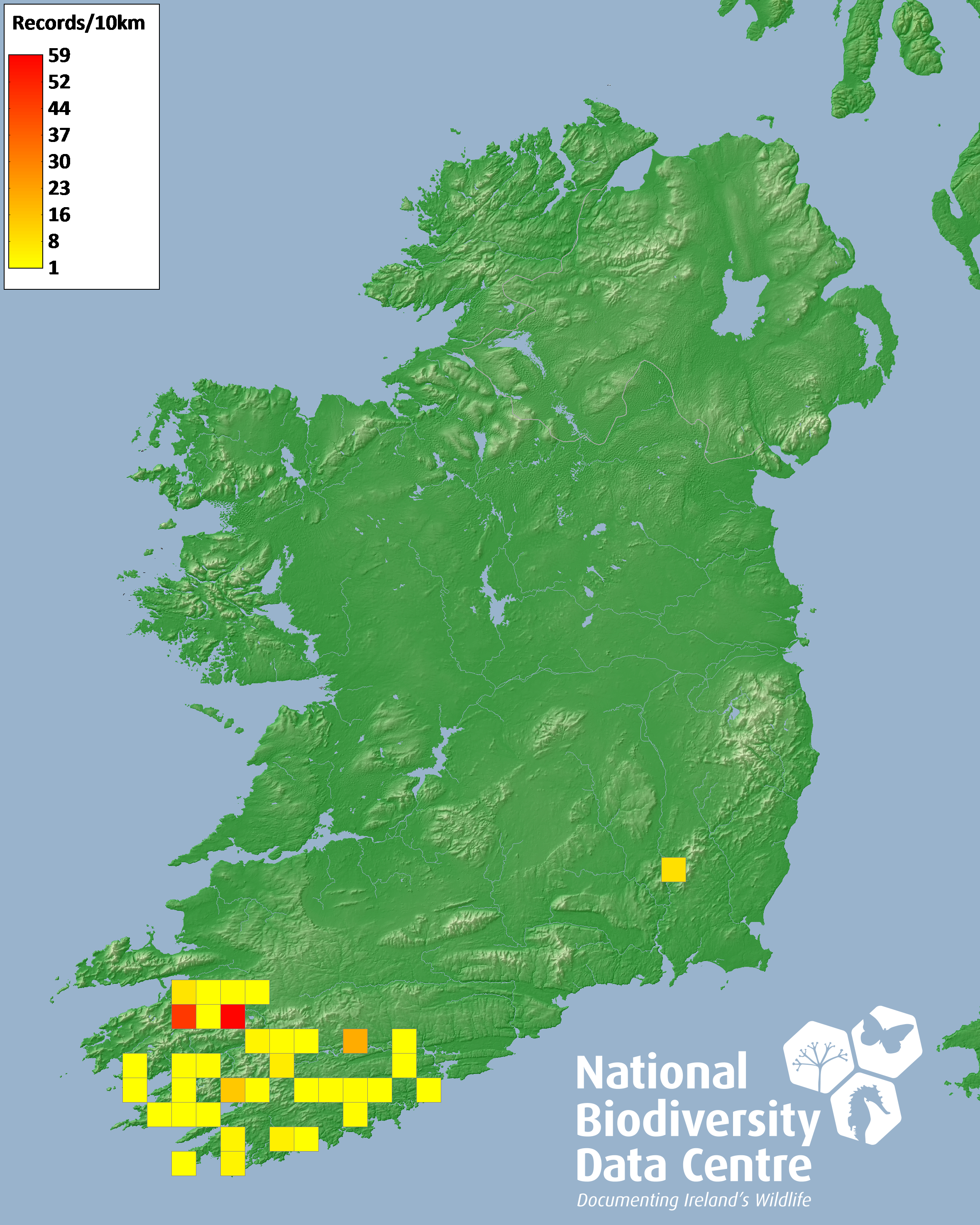 Distribution of the number of records recorded within each 10km grid square (ITM).Marine Map - 50km