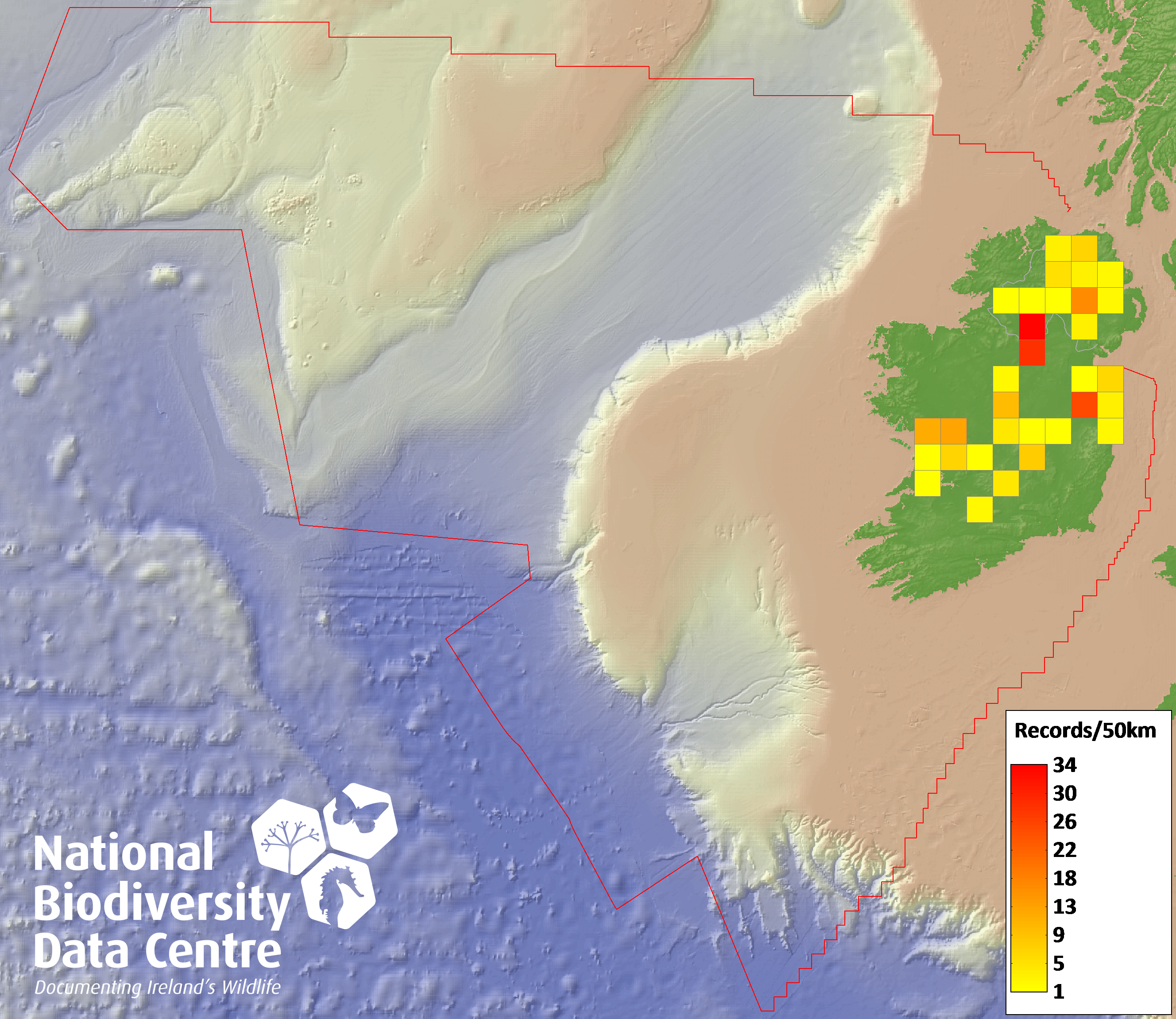 Distribution of the number of records recorded within each 10km grid square (ITM).Marine Map - 50km