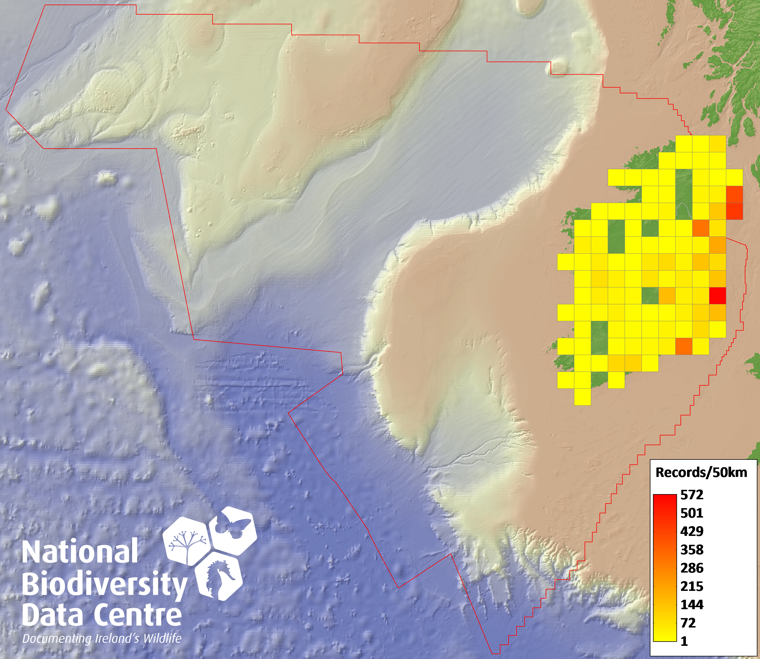 Distribution of the number of records recorded within each 10km grid square (ITM).Marine Map - 50km