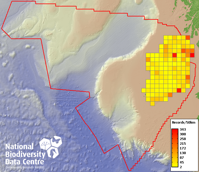 Distribution of the number of records recorded within each 10km grid square (ITM).Marine Map - 50km