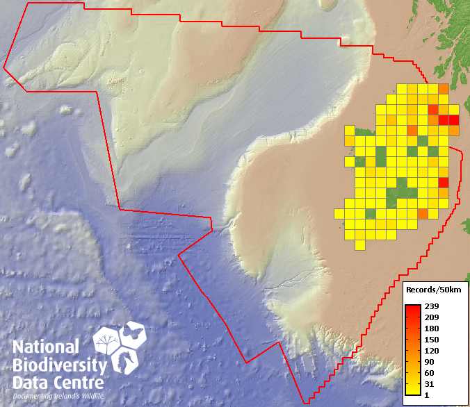 Distribution of the number of records recorded within each 10km grid square (ITM).Marine Map - 50km