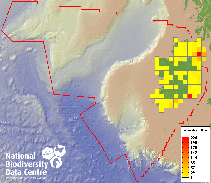 Distribution of the number of records recorded within each 10km grid square (ITM).Marine Map - 50km