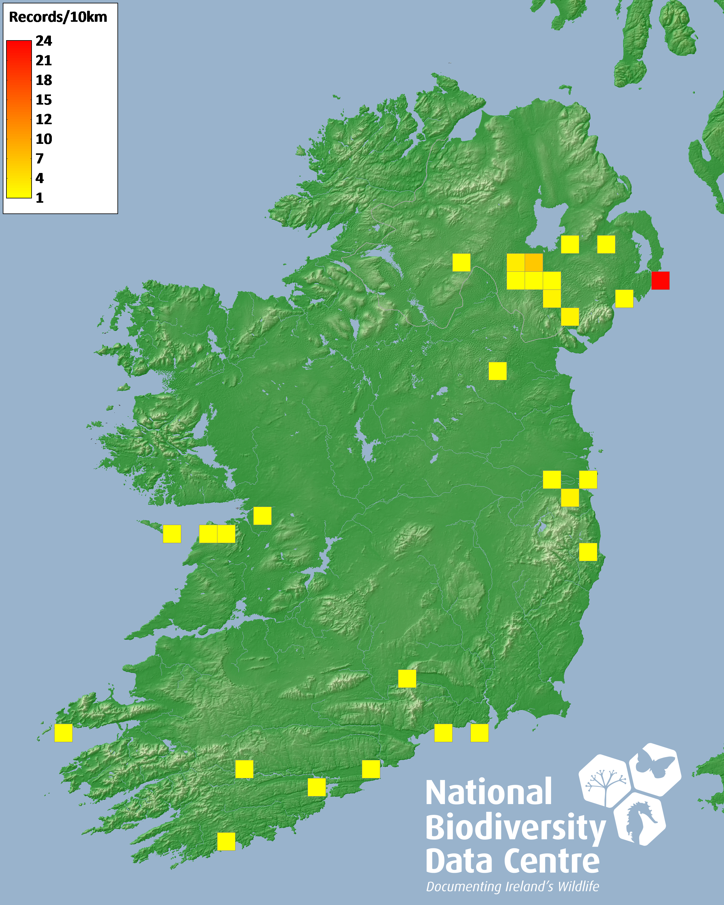 Distribution of the number of records recorded within each 10km grid square (ITM).Marine Map - 50km