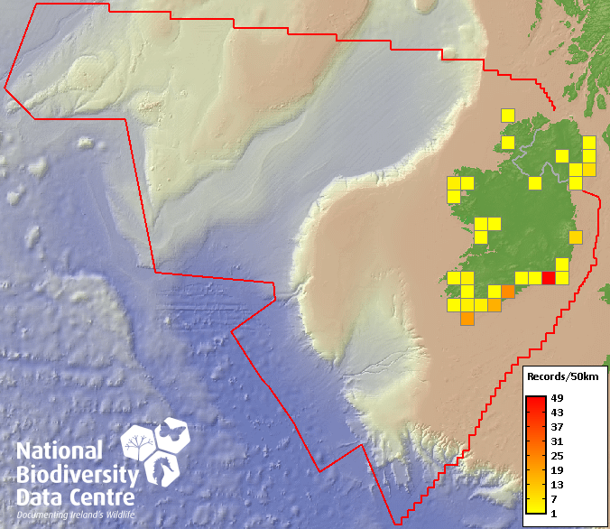 Distribution of the number of records recorded within each 10km grid square (ITM).Marine Map - 50km