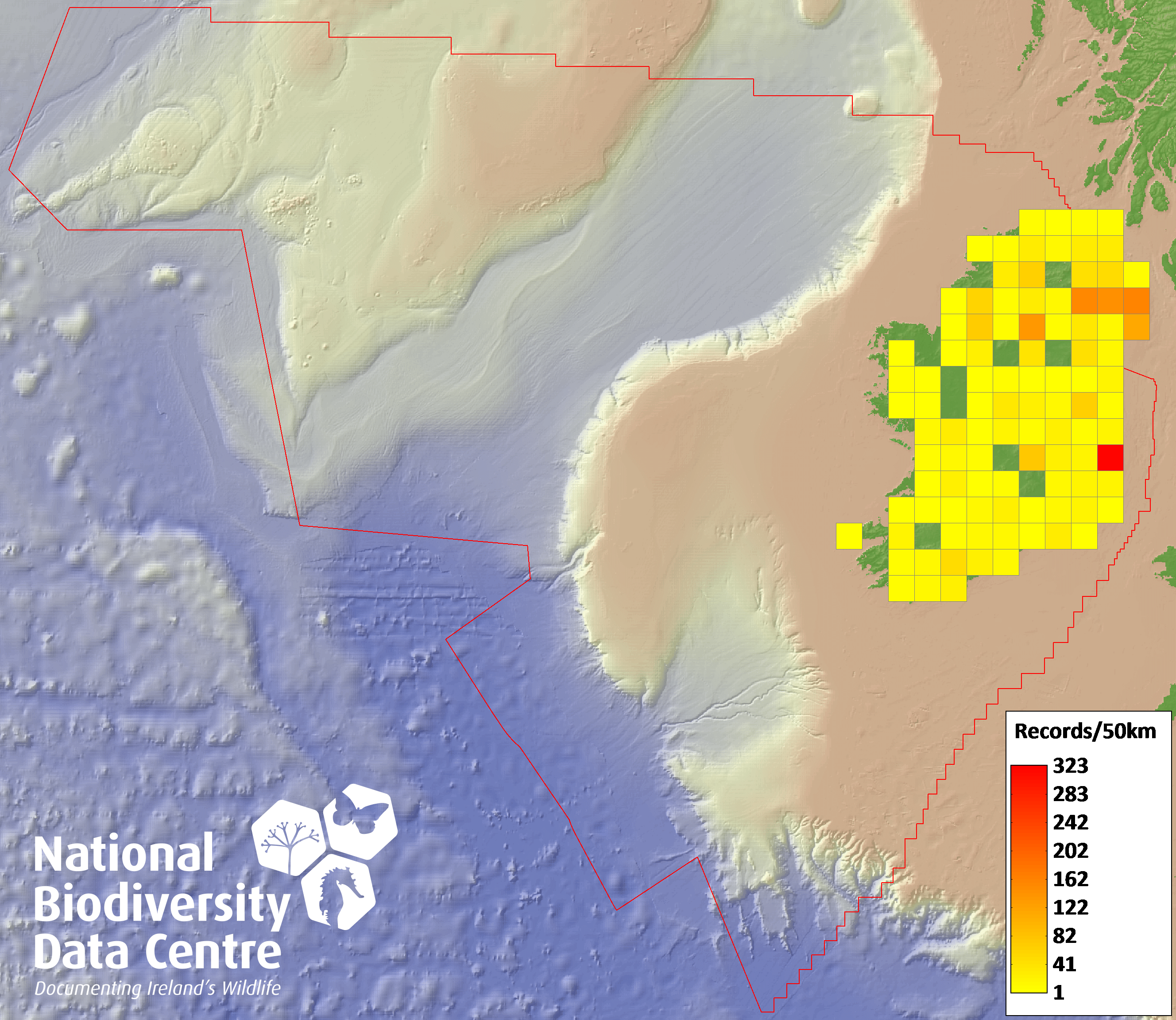 Distribution of the number of records recorded within each 10km grid square (ITM).Marine Map - 50km