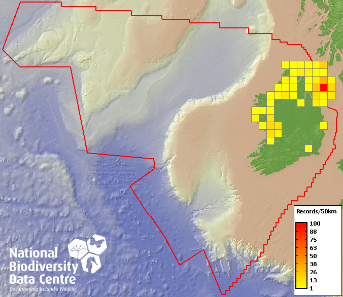 Distribution of the number of records recorded within each 10km grid square (ITM).Marine Map - 50km
