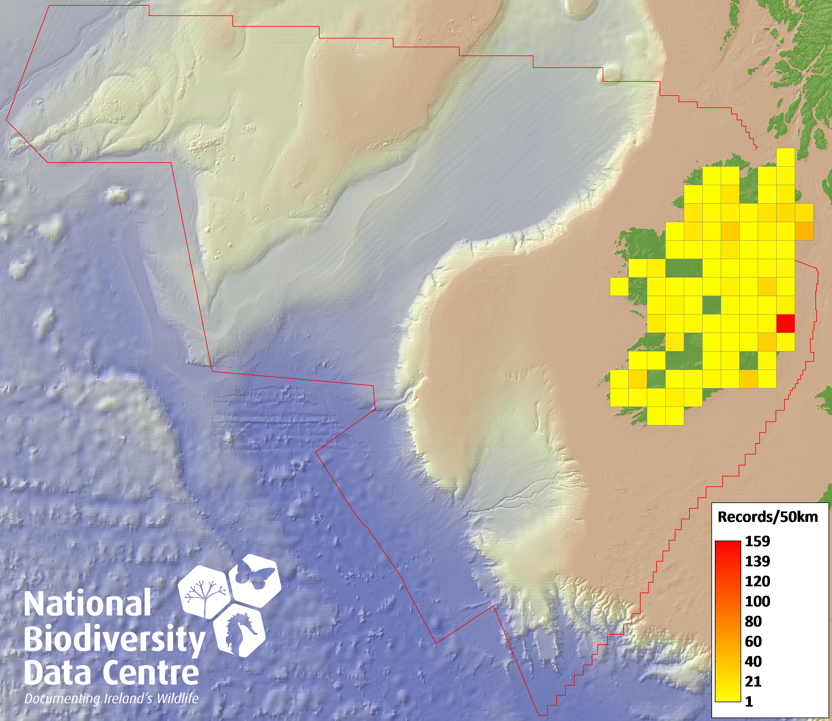 Distribution of the number of records recorded within each 10km grid square (ITM).Marine Map - 50km