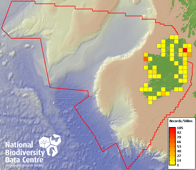 Distribution of the number of records recorded within each 10km grid square (ITM).Marine Map - 50km