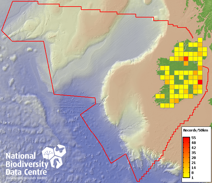 Distribution of the number of records recorded within each 10km grid square (ITM).Marine Map - 50km