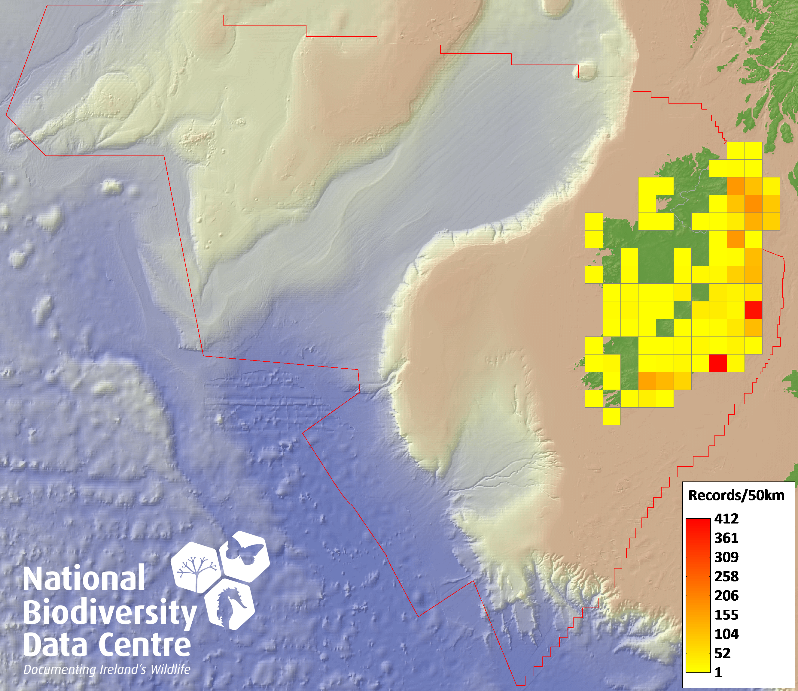 Distribution of the number of records recorded within each 10km grid square (ITM).Marine Map - 50km