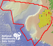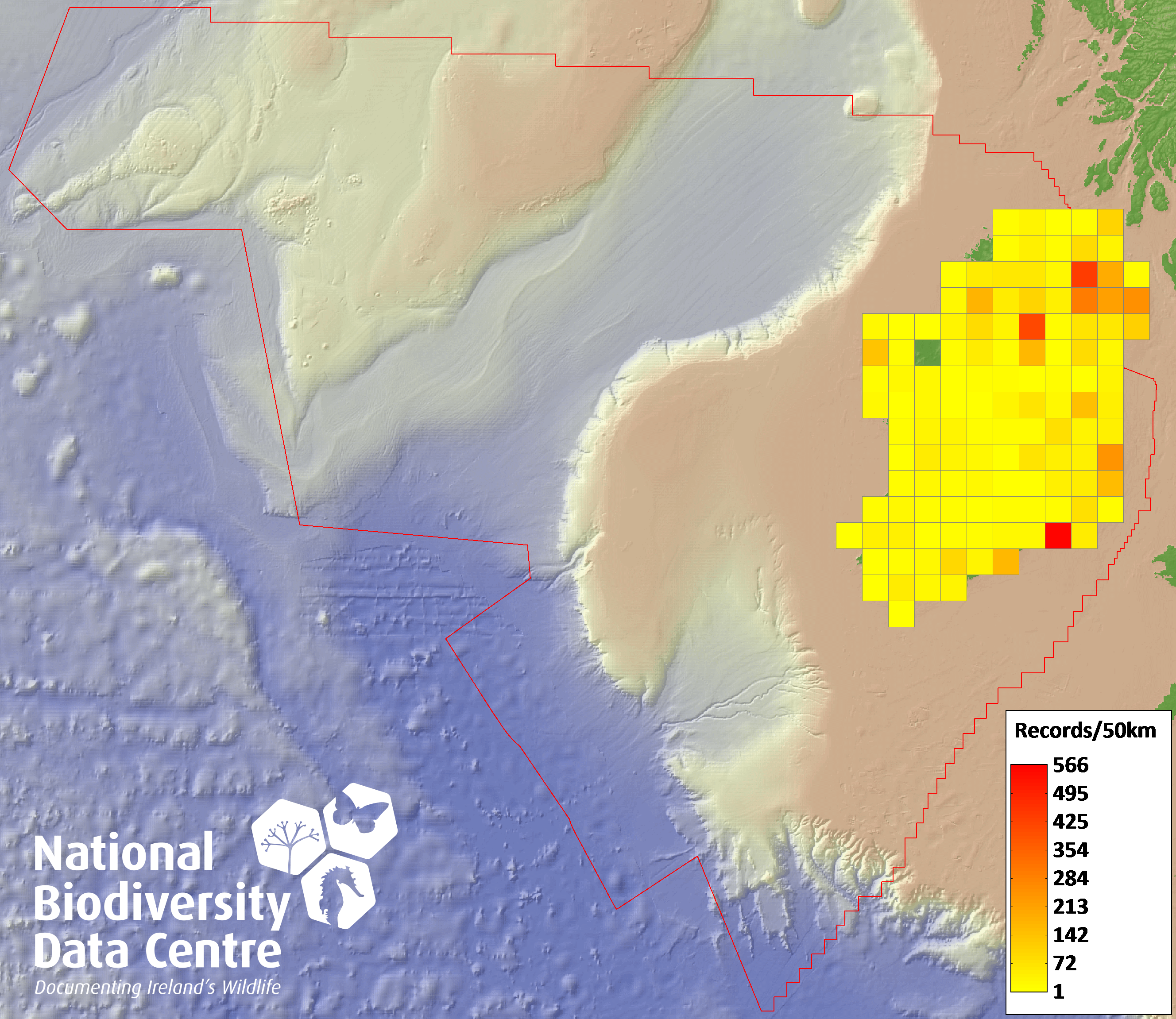 Distribution of the number of records recorded within each 10km grid square (ITM).Marine Map - 50km