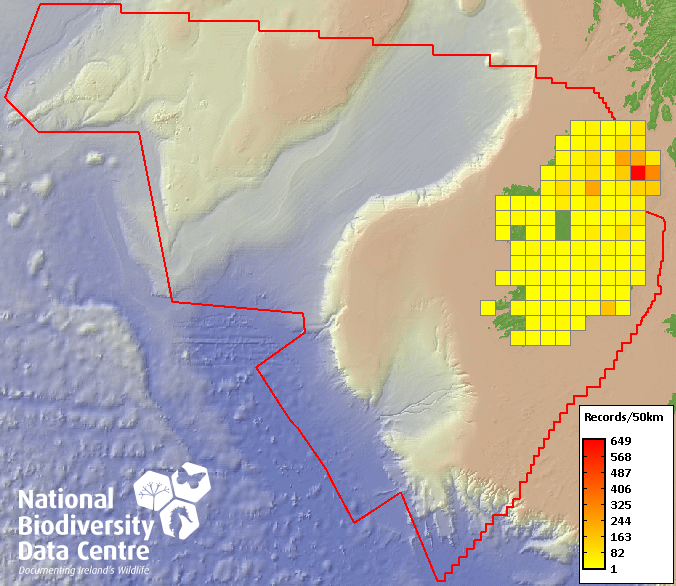 Distribution of the number of records recorded within each 10km grid square (ITM).Marine Map - 50km