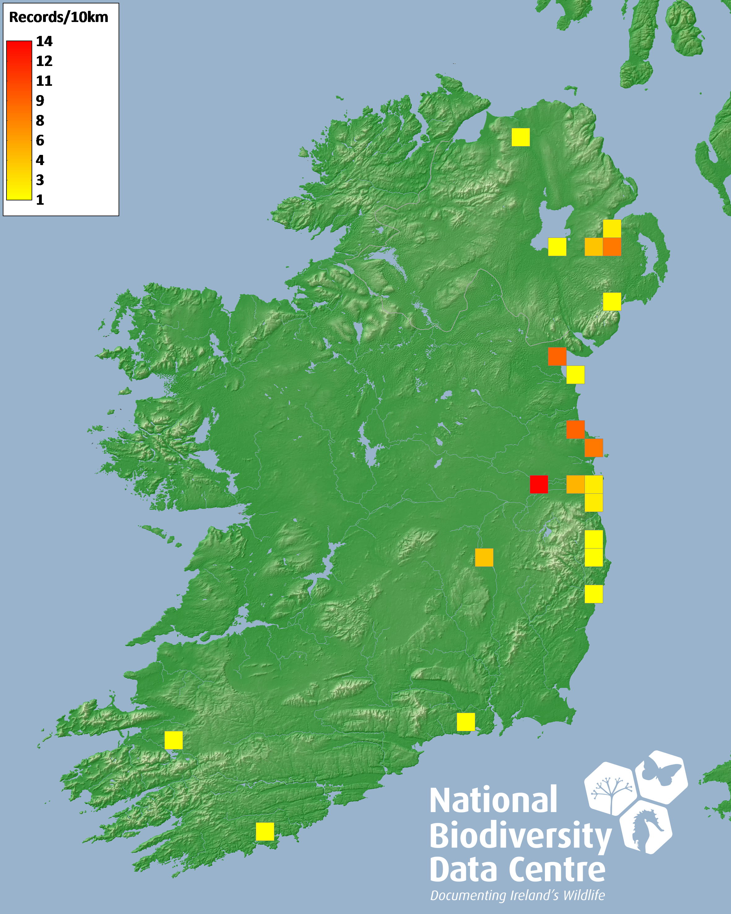 Distribution of the number of records recorded within each 10km grid square (ITM).Marine Map - 50km
