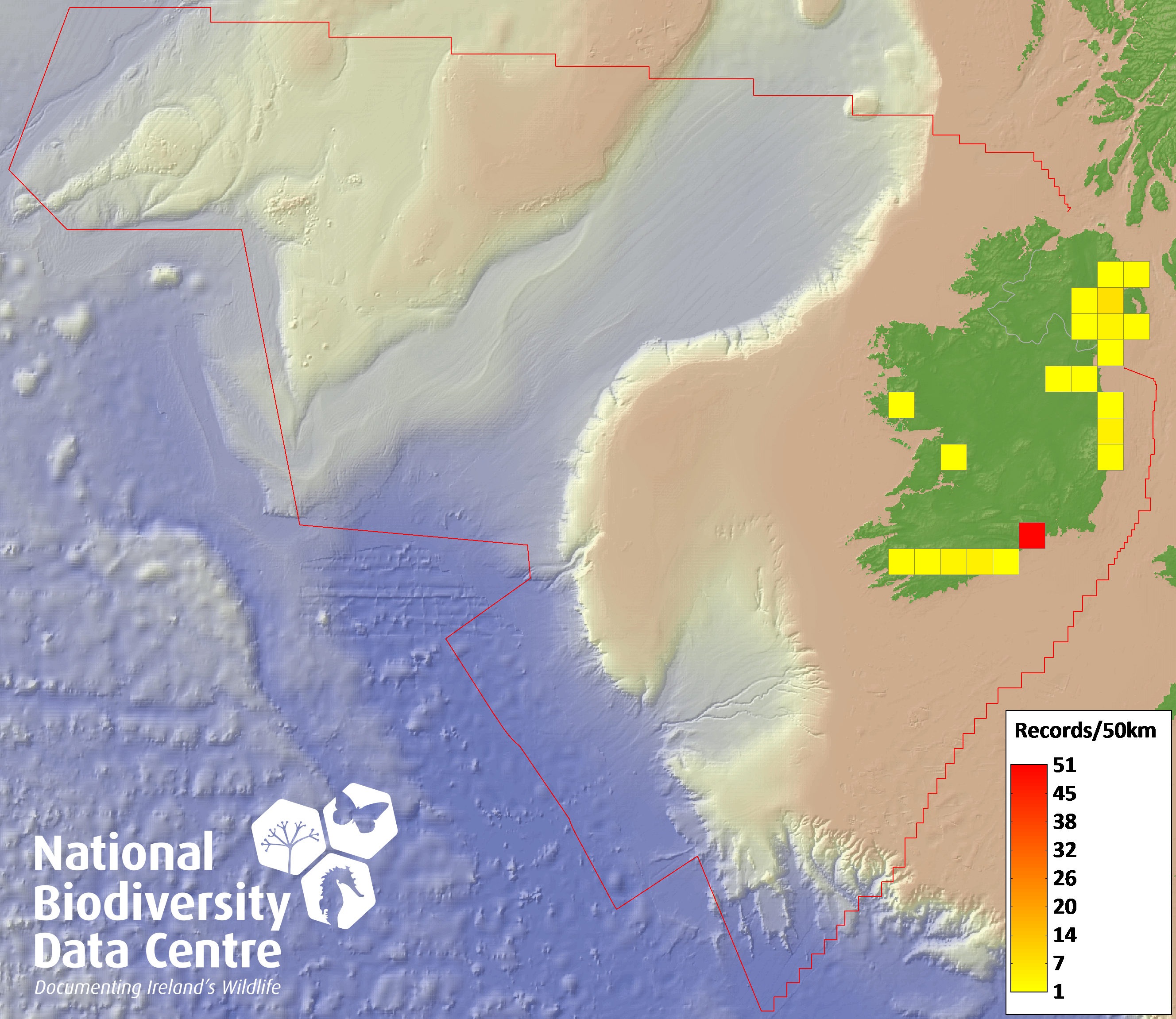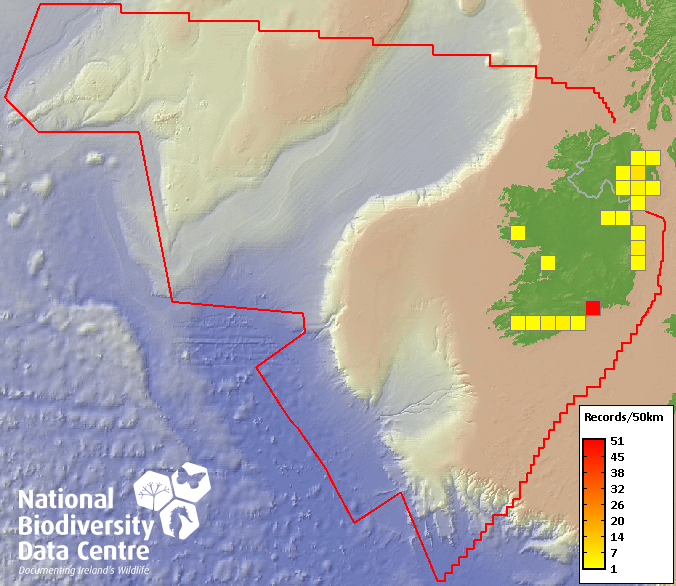 Distribution of the number of records recorded within each 10km grid square (ITM).Marine Map - 50km