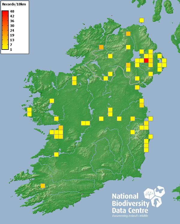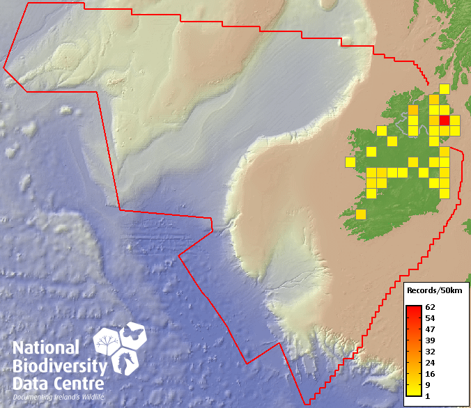 Distribution of the number of records recorded within each 10km grid square (ITM).Marine Map - 50km