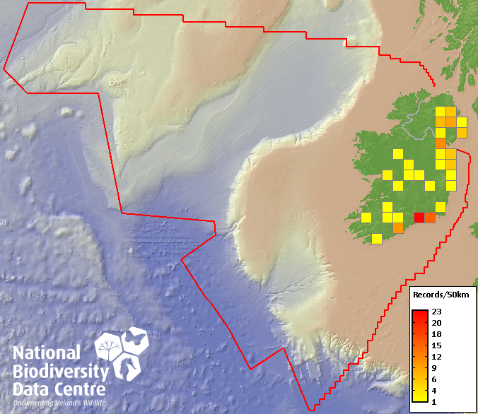 Distribution of the number of records recorded within each 10km grid square (ITM).Marine Map - 50km