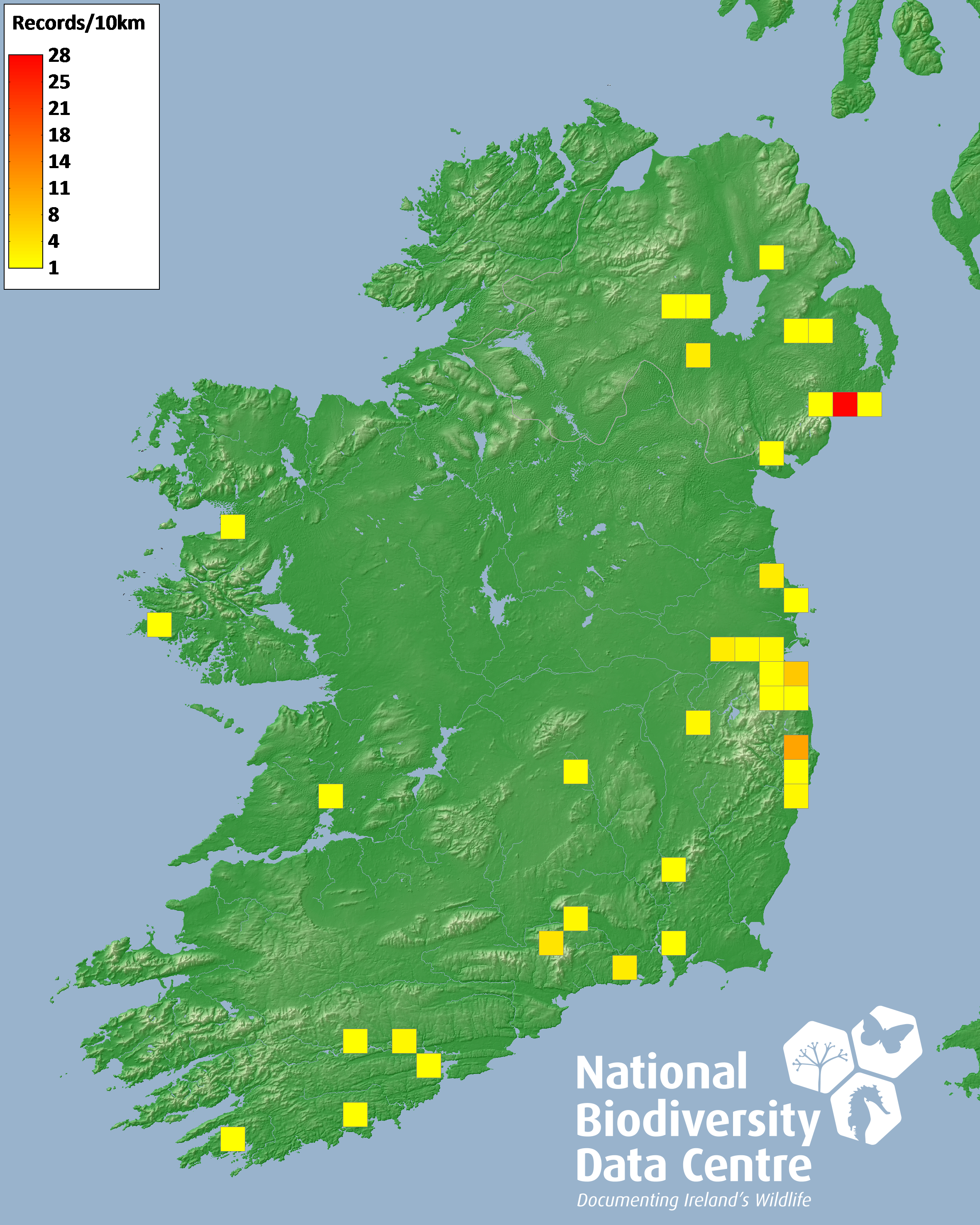 Distribution of the number of records recorded within each 10km grid square (ITM).Marine Map - 50km