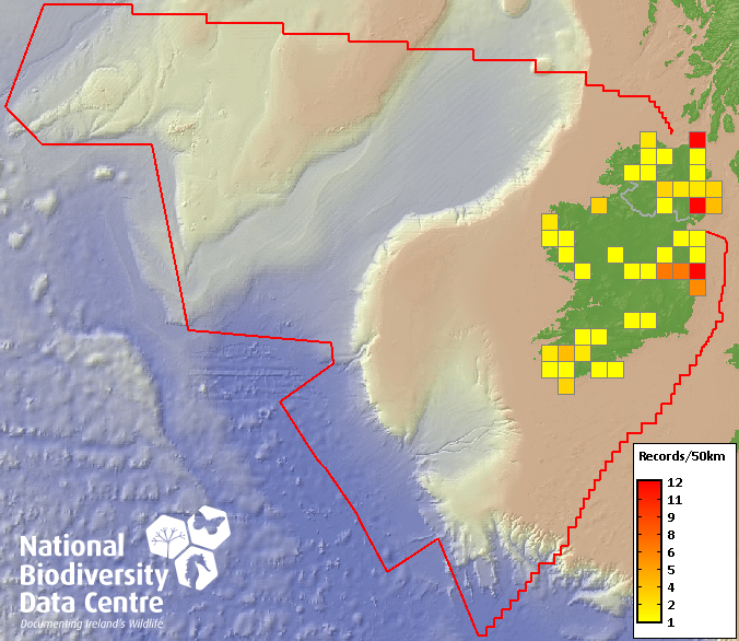 Distribution of the number of records recorded within each 10km grid square (ITM).Marine Map - 50km