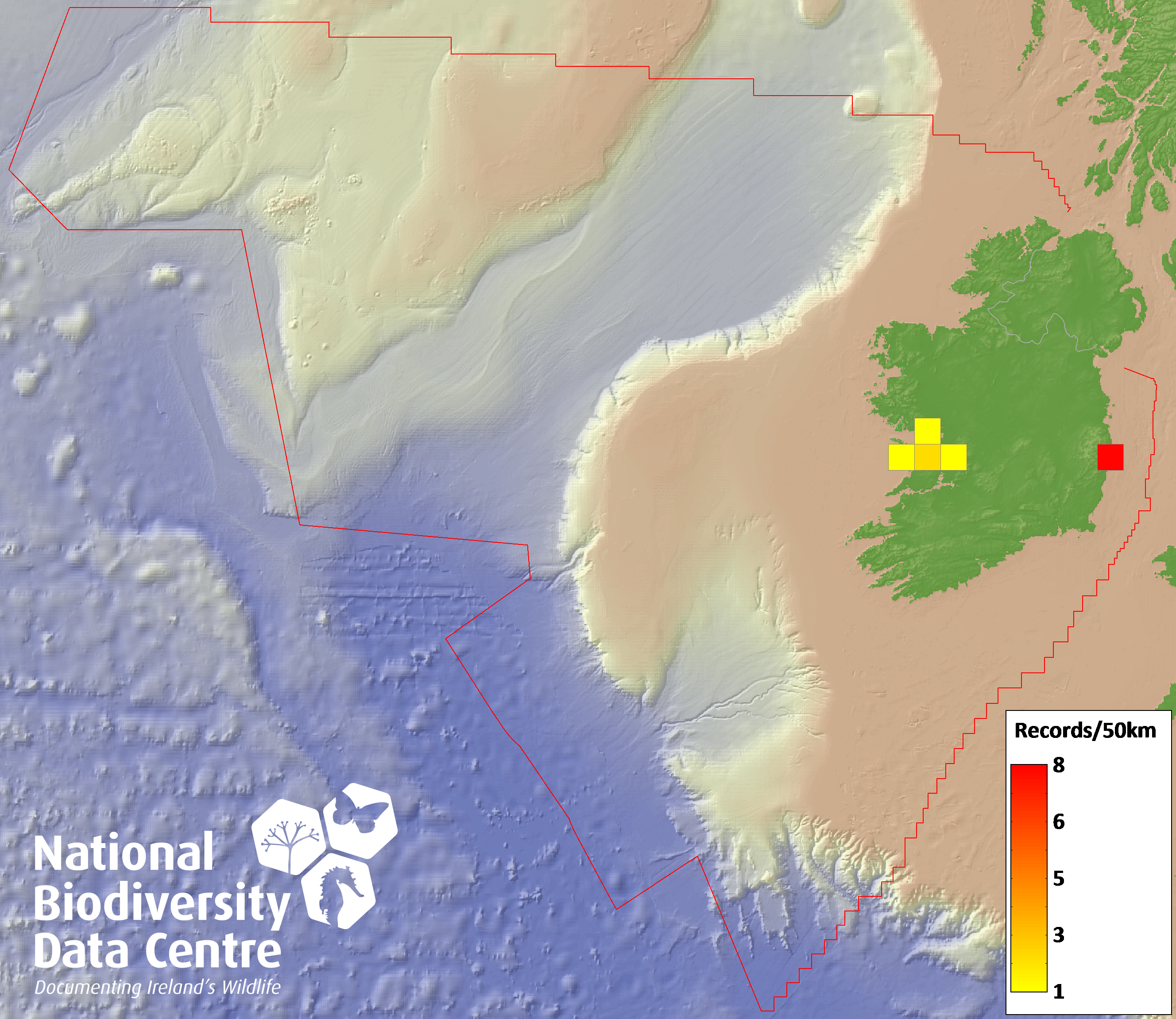 Distribution of the number of records recorded within each 10km grid square (ITM).Marine Map - 50km