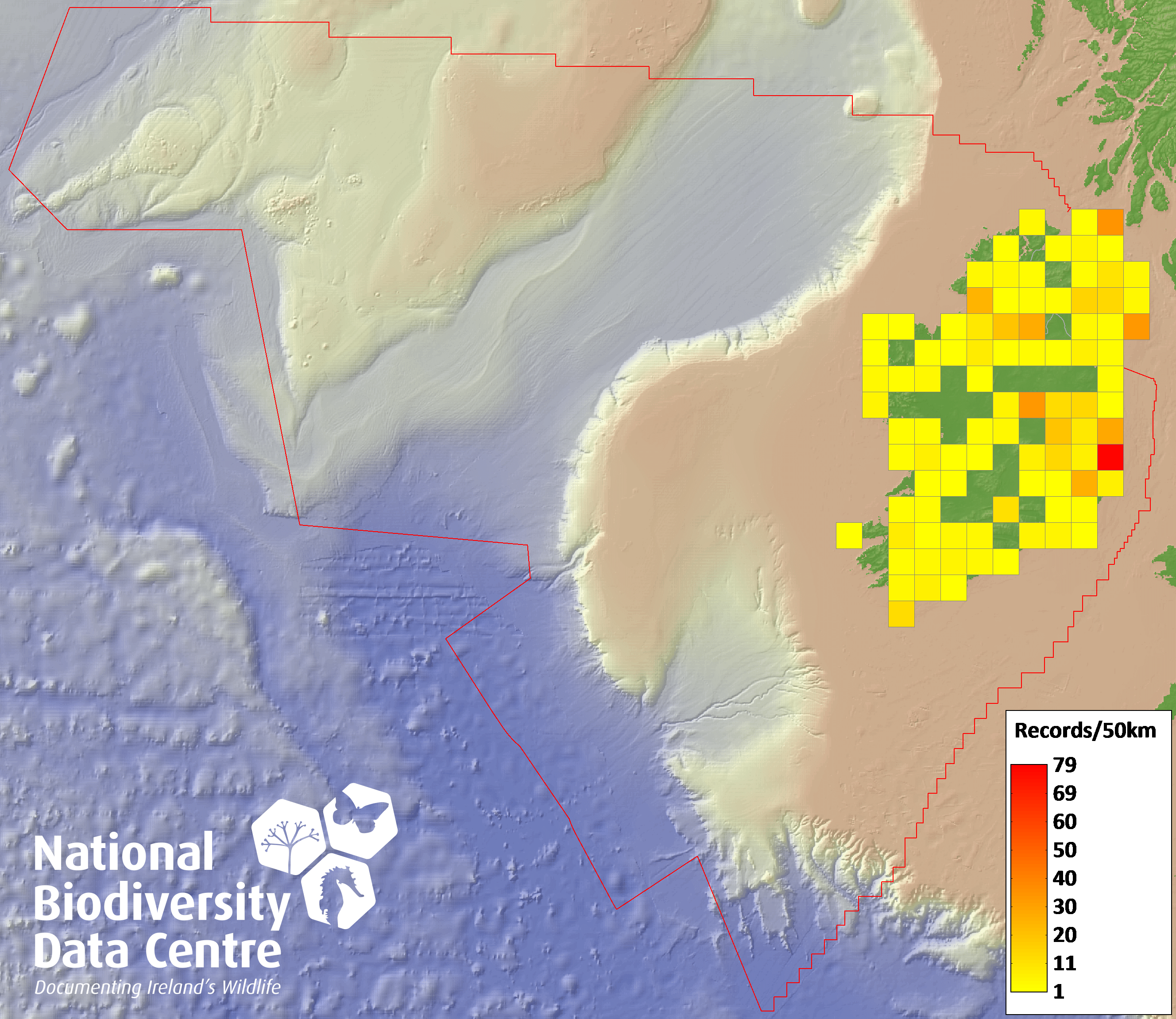 Distribution of the number of records recorded within each 10km grid square (ITM).Marine Map - 50km