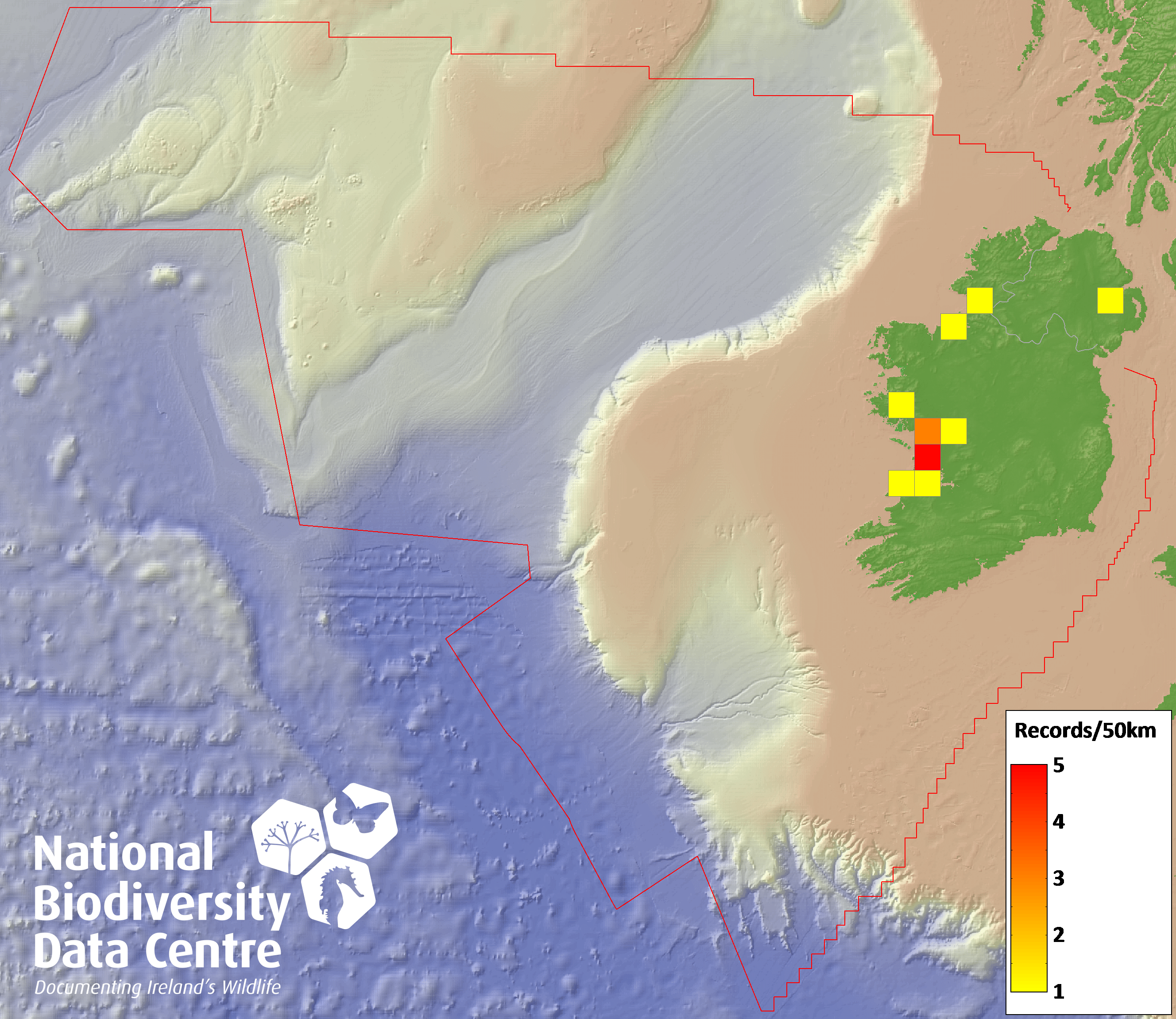 Distribution of the number of records recorded within each 10km grid square (ITM).Marine Map - 50km