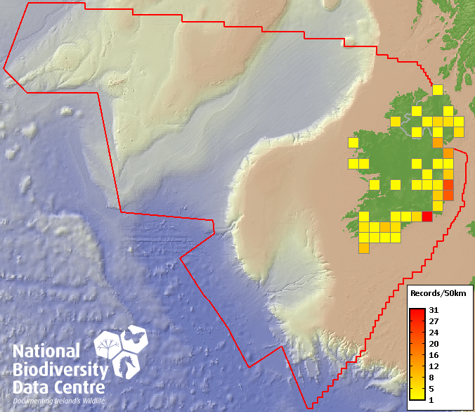 Distribution of the number of records recorded within each 10km grid square (ITM).Marine Map - 50km