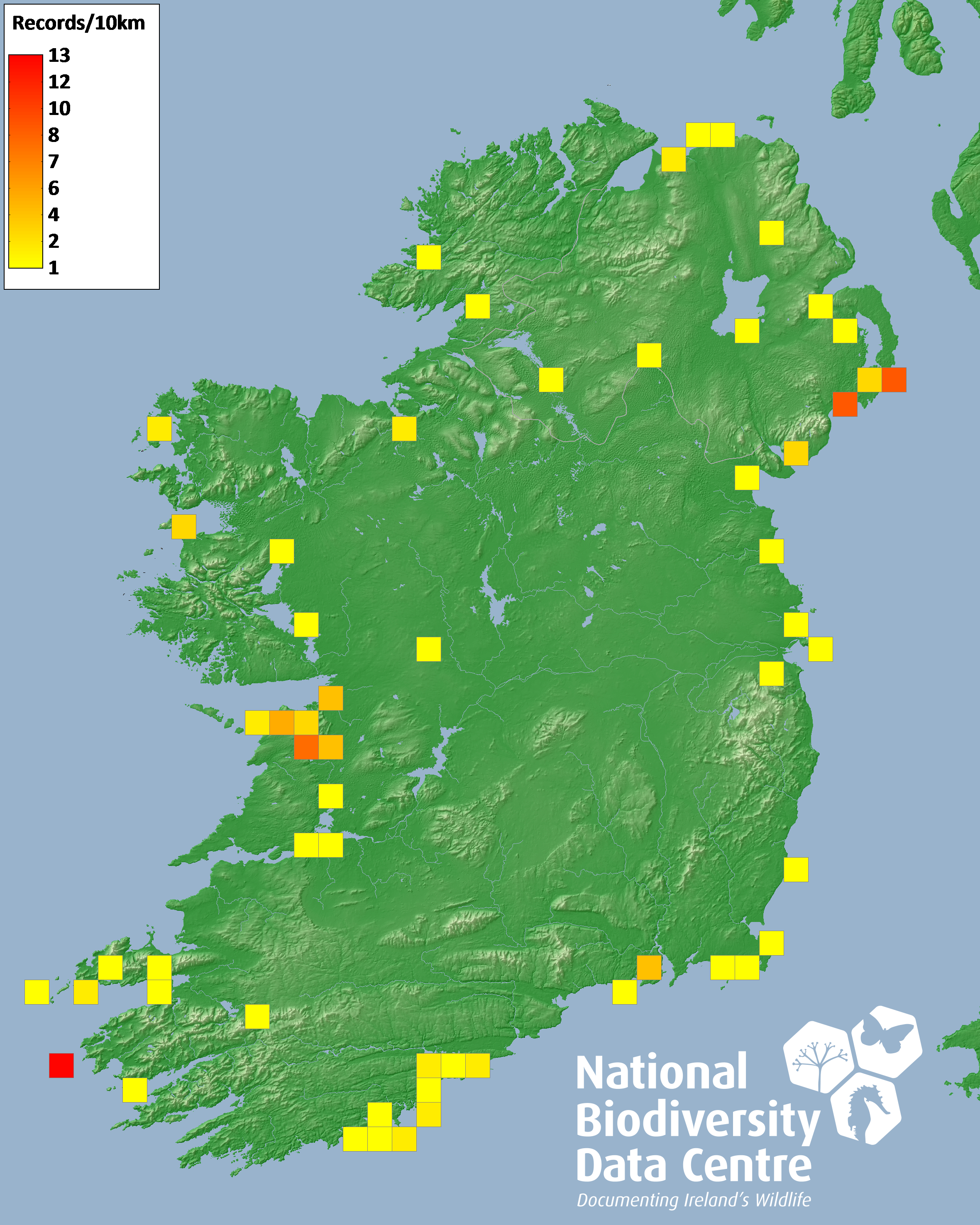 Distribution of the number of records recorded within each 10km grid square (ITM).Marine Map - 50km