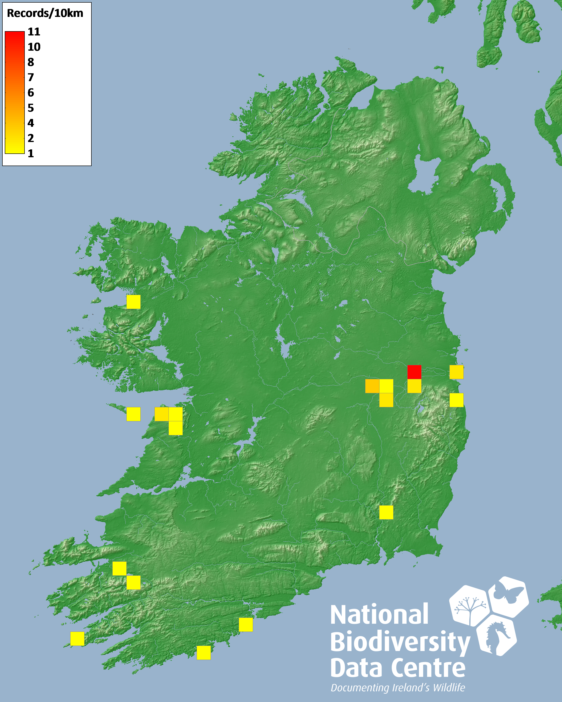 Distribution of the number of records recorded within each 10km grid square (ITM).Marine Map - 50km