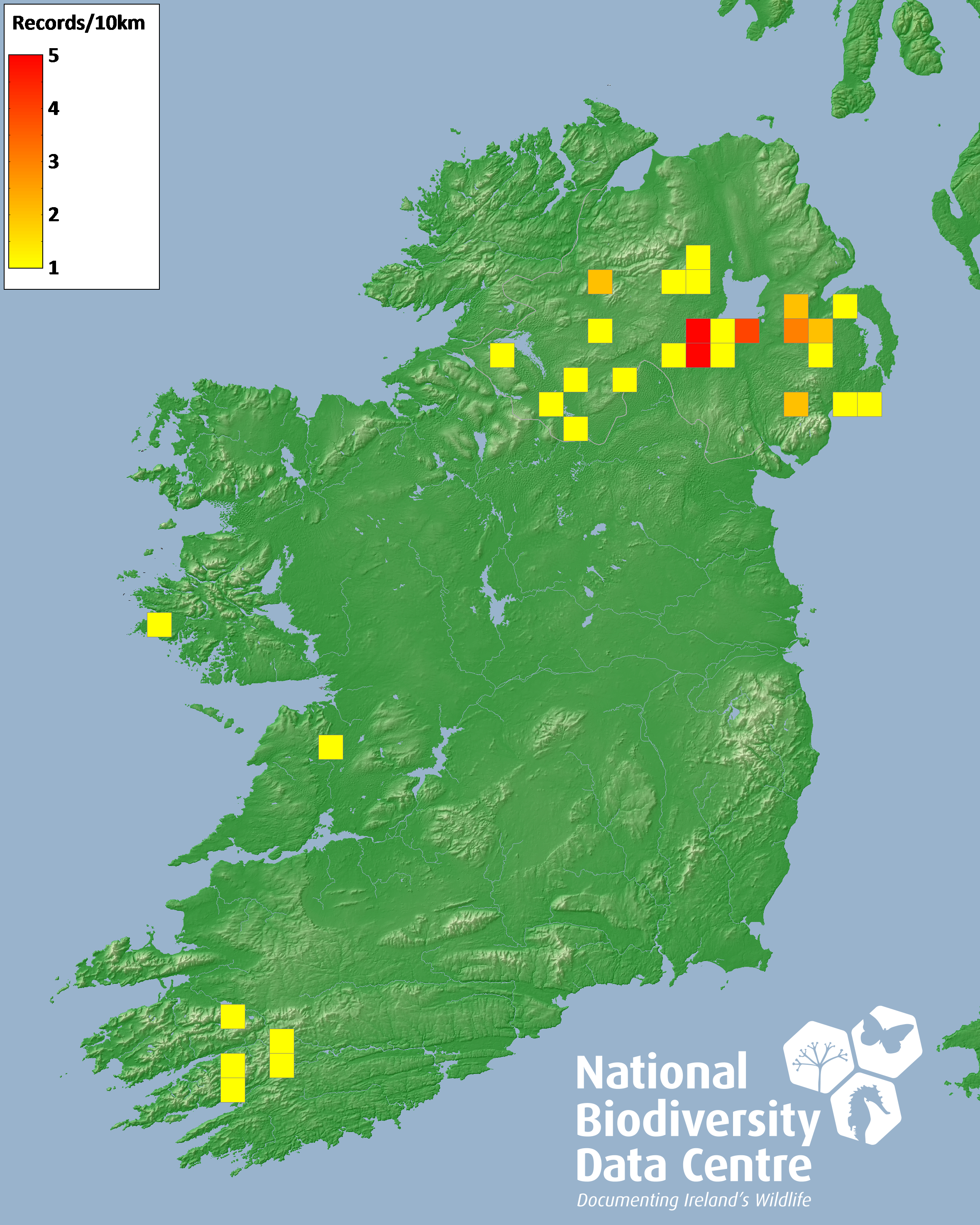Distribution of the number of records recorded within each 10km grid square (ITM).Marine Map - 50km