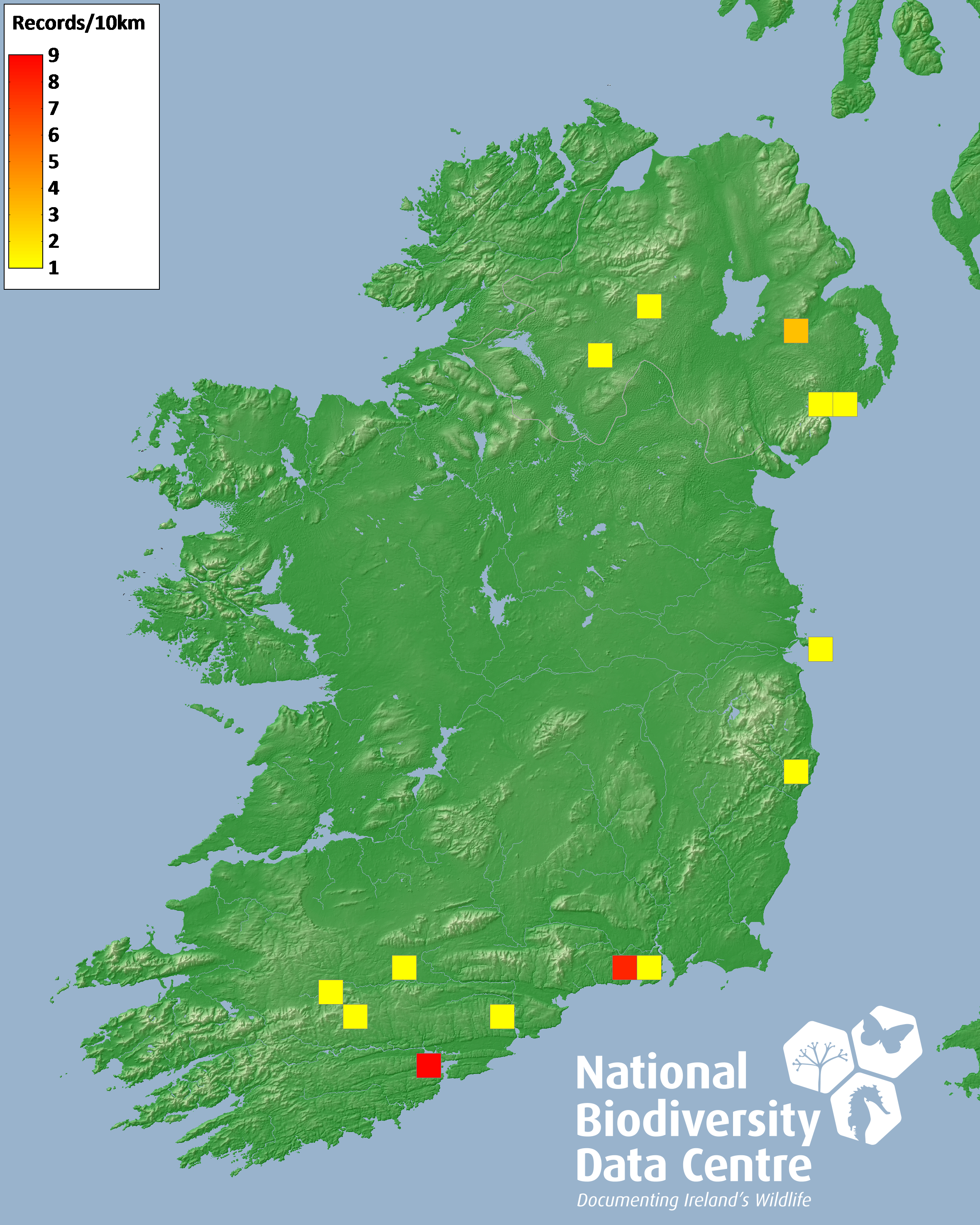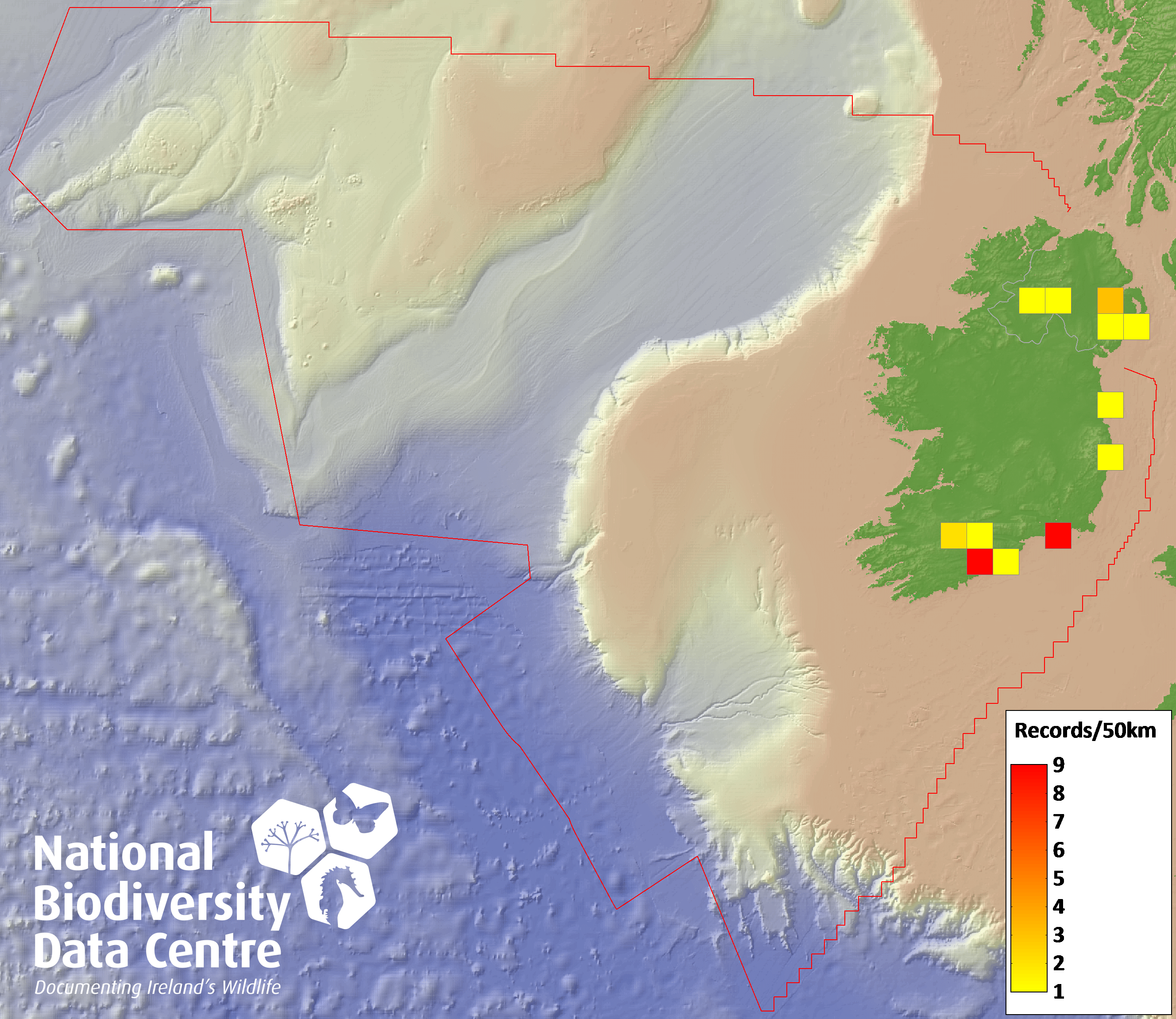 Distribution of the number of records recorded within each 10km grid square (ITM).Marine Map - 50km