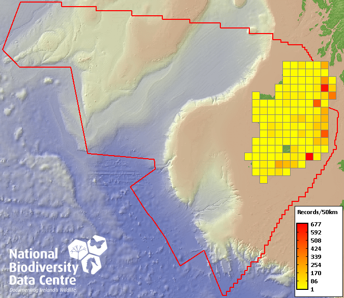 Distribution of the number of records recorded within each 10km grid square (ITM).Marine Map - 50km