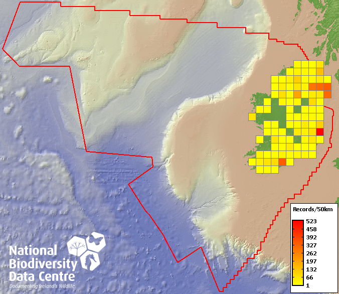 Distribution of the number of records recorded within each 10km grid square (ITM).Marine Map - 50km