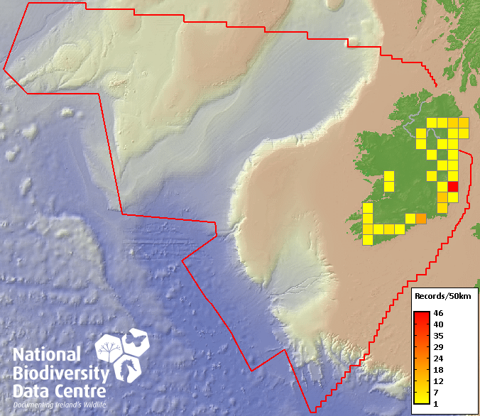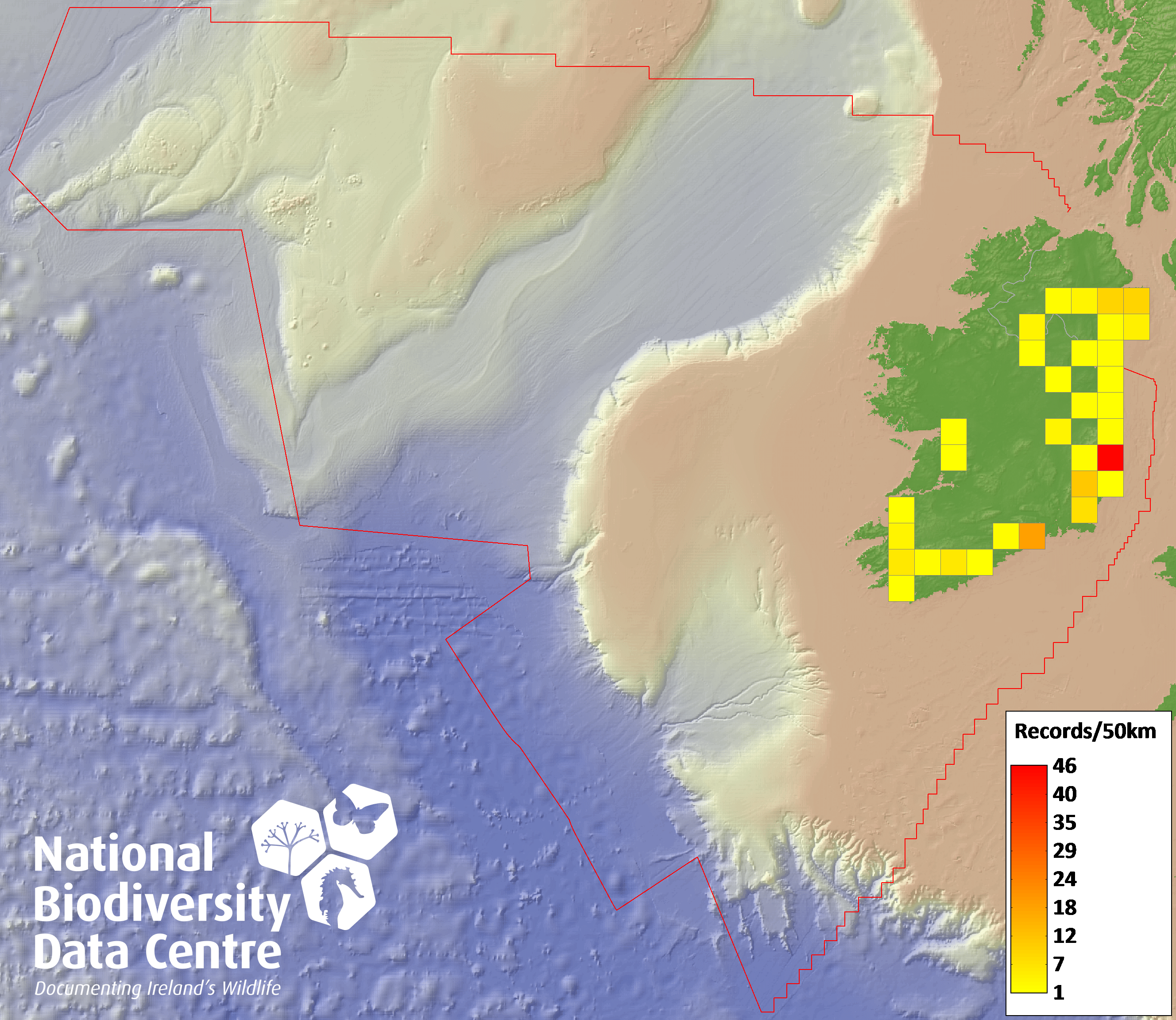 Distribution of the number of records recorded within each 10km grid square (ITM).Marine Map - 50km