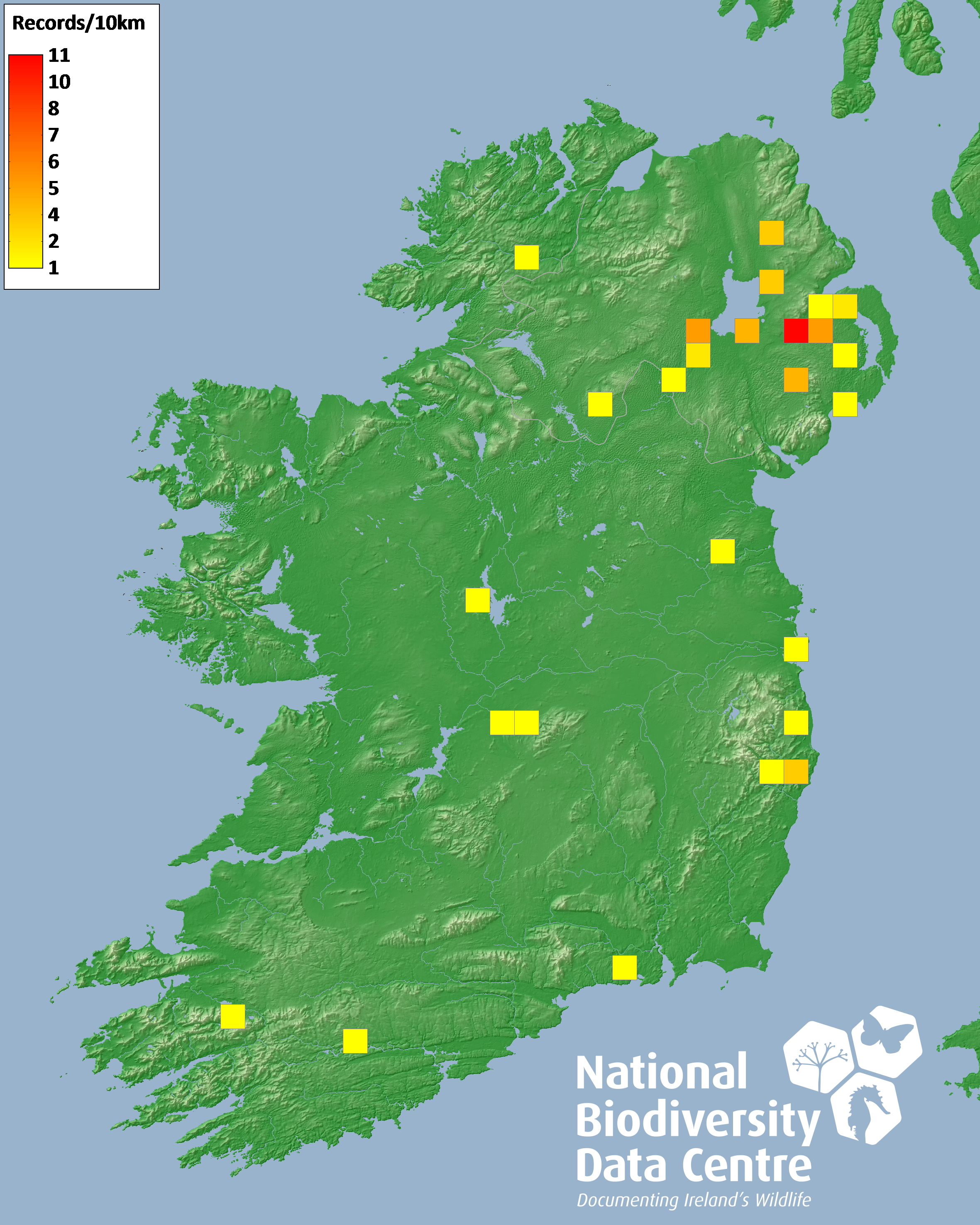 Distribution of the number of records recorded within each 10km grid square (ITM).Marine Map - 50km